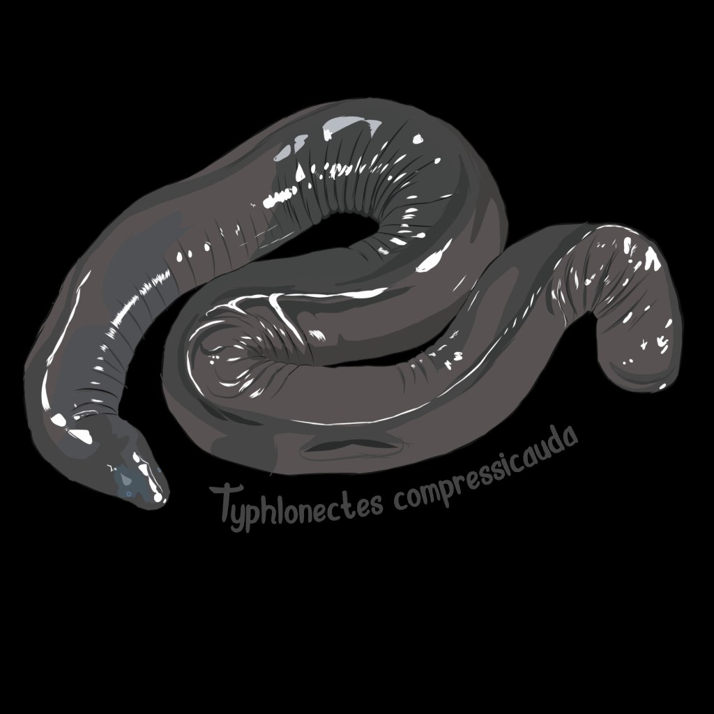 Until recently, when I captured one in a minnow trap in a Miami canal, I had never before seen a live caecilian. A recent paper by scientists from The Florida Museum of Natural History and the Florida Fish and Wildlife Conservation Commission definitively identified the species found in Miami canals as Typhlonectes natans, an aquatic species native to Colombia and Venezuela. This identification was done using morphology and by sequencing the mitochondrial 16S gene and comparing it to that of other sequenced caecilian specimens on the genetic repository GenBank.