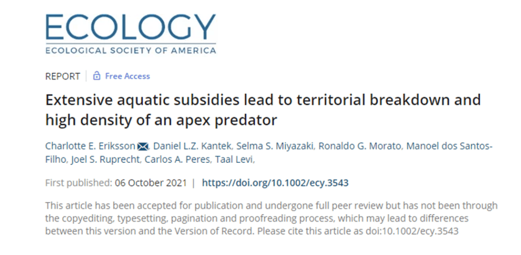 The new paper by Eriksson et al. (2021) examined the density, diet, and social interactions of jaguars in the Brazilian Pantanal. The authors used an extensive system of camera traps and GPS collars, fitted on a subset of 13 individuals, in order to estimate the density of jaguars. Individual jaguars were able to be identified on the camera trap images and videos based on their unique coat patterns. They estimated the population density at 12.4 individuals per 100 square kilometers, which is the highest density estimate to date. For comparison, jaguar density has previously been estimated at 4.5 jaguars per 100 km2 in the Peruvian Amazon, 4.4 jaguars per 100 km2 in the Venezuelan Llanos, and 6.7 jaguars per 100 km2 in the drier southern Pantanal. A natural question is what is supporting such high jaguar population densities in the Pantanal? And what are the consequences of such high density for social behavior?
