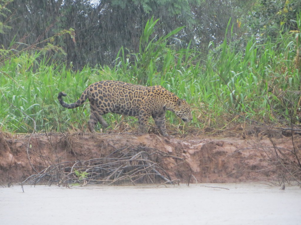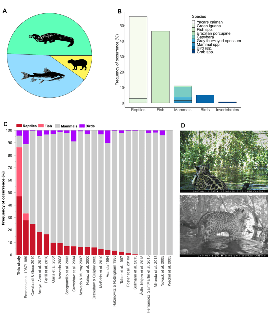 The authors examined the diets of this jaguar population. By examining 138 jaguar scats (i.e. droppings) the authors found a diet dominated by fish and aquatic reptiles. Specifically, 46% of scats contained fish, 55% contained reptiles (almost entirely caiman), and only 11% contained mammal remains (mostly Capybara). As the authors state: “Jaguars in Taiamã [the Pantanal study location] have by far the most aquatic diet and the least mammal consumption of any previously studied population. Although jaguars in Taiamã consume more aquatic reptiles than has ever been observed, it is fish consumption that makes this population truly unique. As far as we know, this is the most piscivorous diet of any large felid and among the most for any terrestrial hypercarnivore. Even the tigers (Panthera tigris) in the Sundarbans mangroves of India still consume mostly terrestrial mammals.”