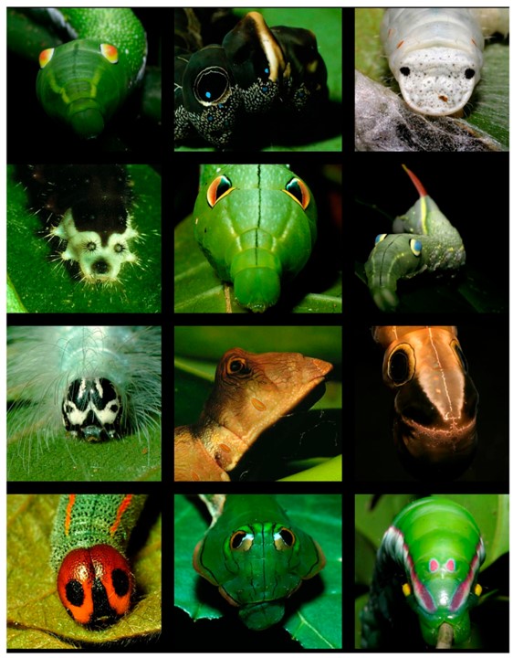 You, like billions of other individuals and hundreds of other species for tens of millions of years, have just been a player in an act of natural selection favoring mutations that lead to the multitudes of “false eye” color patterns, “eyespot” patterns, or “facsimiles of eyes” and “faces” adorning tropical caterpillars and pupae. These eyespots are round or oval and mono- or polychromatic, with round or slit pupils. Associated body patterns often suggest other head and facial features, which in turn enhance the eye-like nature of the spots. Depending on the angle of observation and on how much or which part shows, one pattern may even simulate different faces. None of these patterns exactly matches the eyes or face of any particular species of predator; but, even when quickly and partially glimpsed, all give the illusion of an eye or face. These false eyes are mimicking the eyes and faces of such predators of insect-eating birds as snakes, lizards, other birds, and small mammals, as perceived at close range by the insectivorous birds in their natural world. These color patterns—long noticed by field naturalists, evolutionary behaviorists, ecologists, taxonomists, ecotourists, and, no doubt, our distant ancestors—and the birds’ reactions to them, are the evolutionary footprints of predator/prey encounters as shallow as today and as deep as the first terrestrial vertebrate eyes. Such footprints are scattered across many diurnal vertebrate/prey interactions, but here we focus only on those of caterpillars and pupae and the birds that eat them.