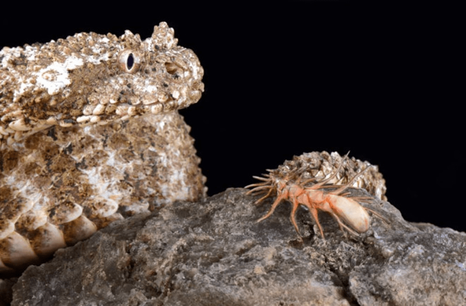 Undoubtedly this strategy is most well developed in the spider-tailed horned viper (Pseudocerastes urarachnoides). This recently described species, native to the Middle East, has a spider like knob on the end of its tail with long scales that resemble legs. It waves the lure in front of its face to attract birds!