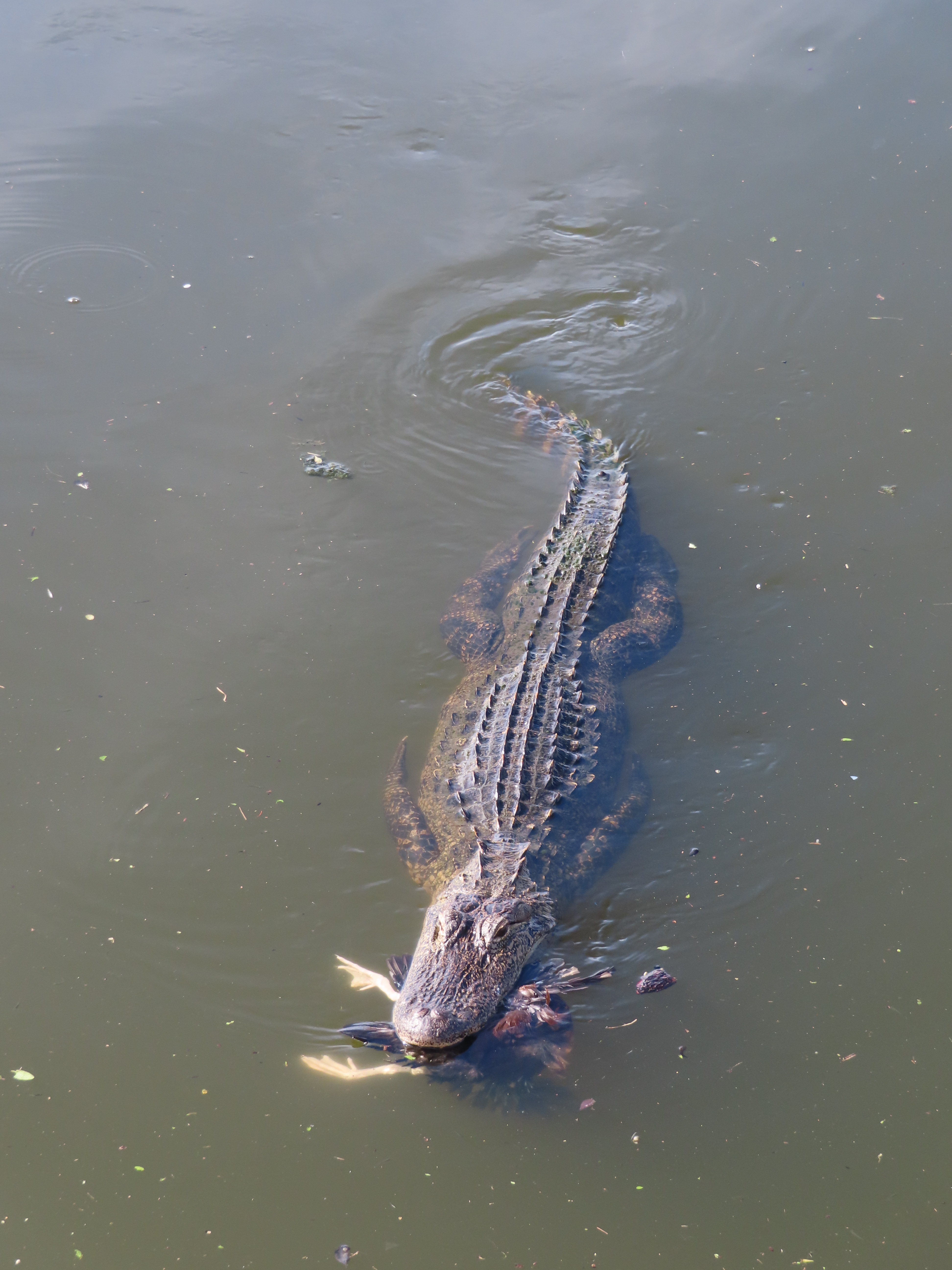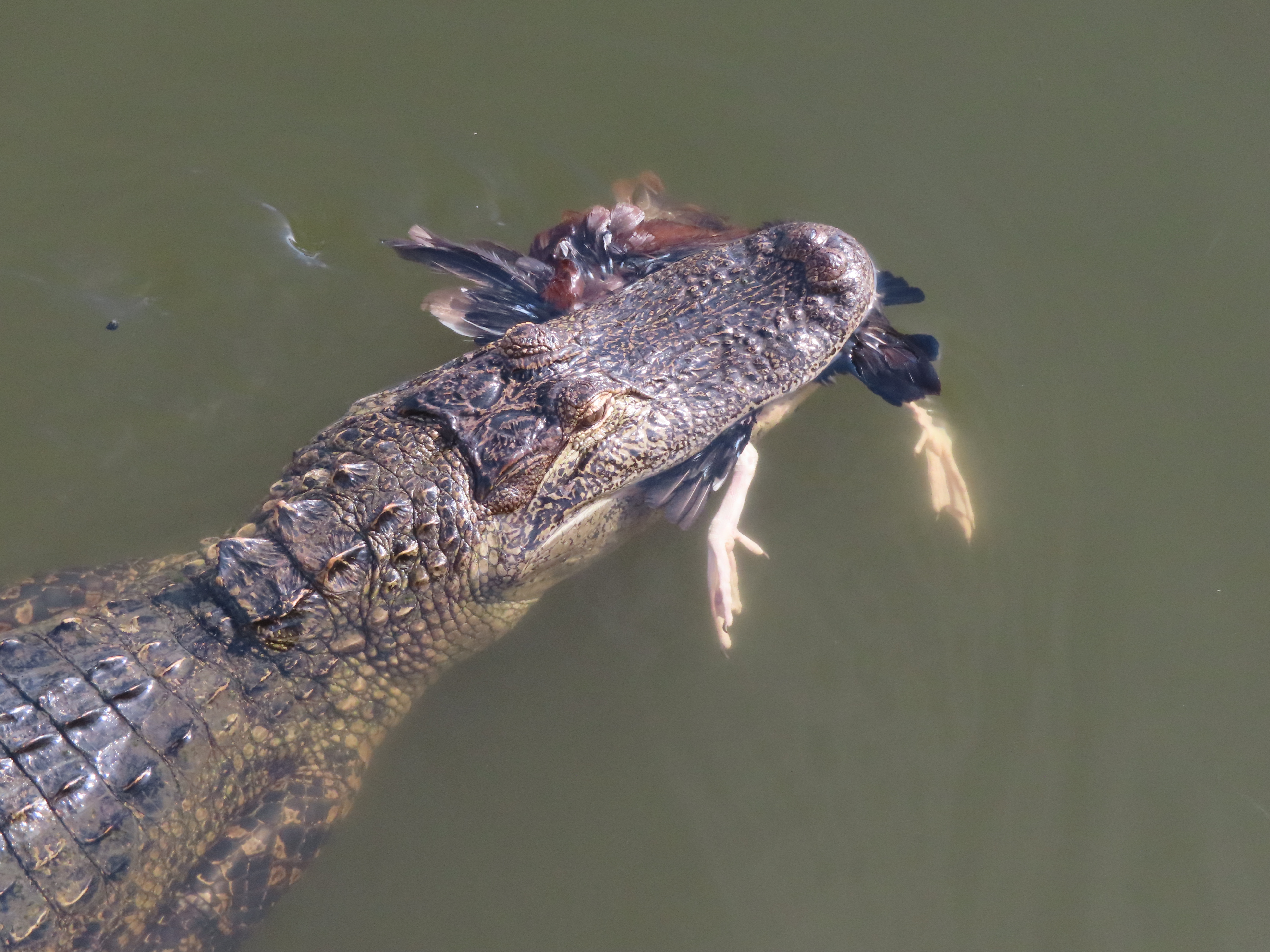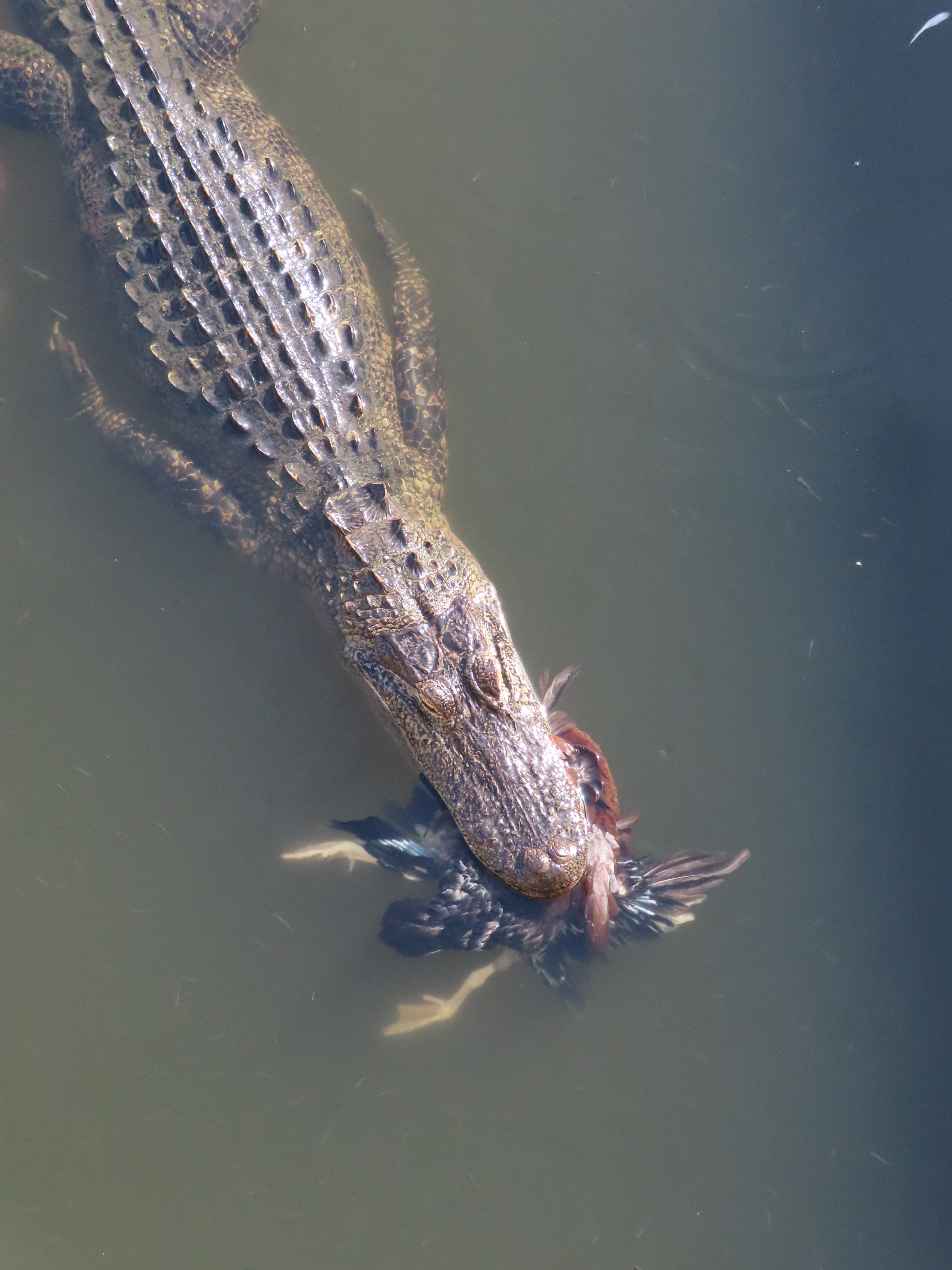 When I came upon the scene the alligator already had the dead bird in its mouth. I didn’t witness the alligator capture the bird, and for all I know it could have been scavenged. I stayed for about an hour and watched the alligator as I was hoping to get pictures of it swallowing the bird. But this never happened. Instead, the alligator just kept swimming around with the bird in its mouth. Several other people stopped to look and photograph the alligator while I was there. One of them commented: “It looks like a dog parading around with a bone in its mouth.” I thought this was an apt comment. It seemed as if the alligator was prominently displaying its prize for all to see. It was completely unphased by the presence of people. Actually, it was swimming in loops along the edge of the pond directly adjacent to the paved path where people were walking – as if it were showing off its catch. It would occasionally disappear under the water for a few minutes and then surface again with the bird.
