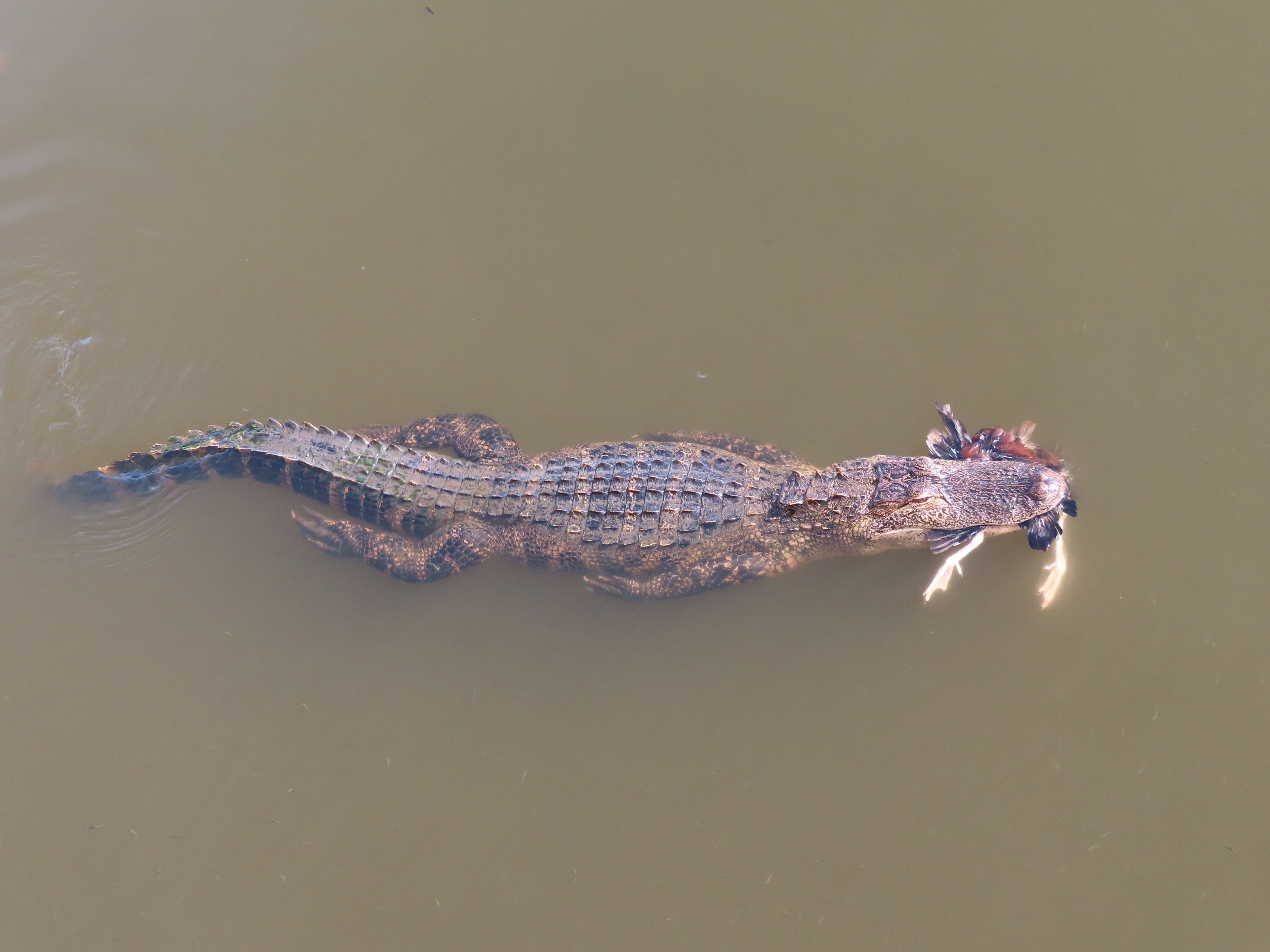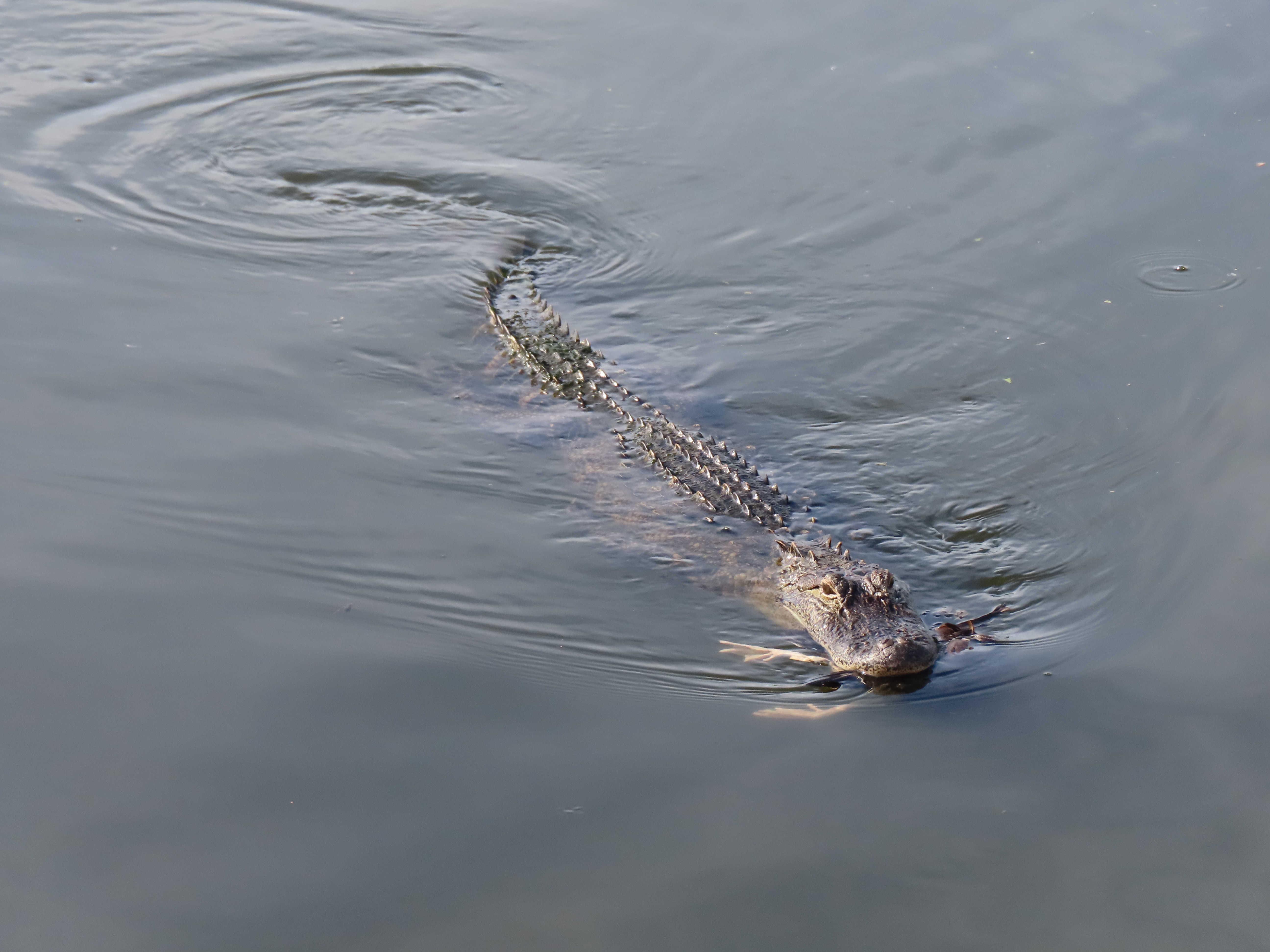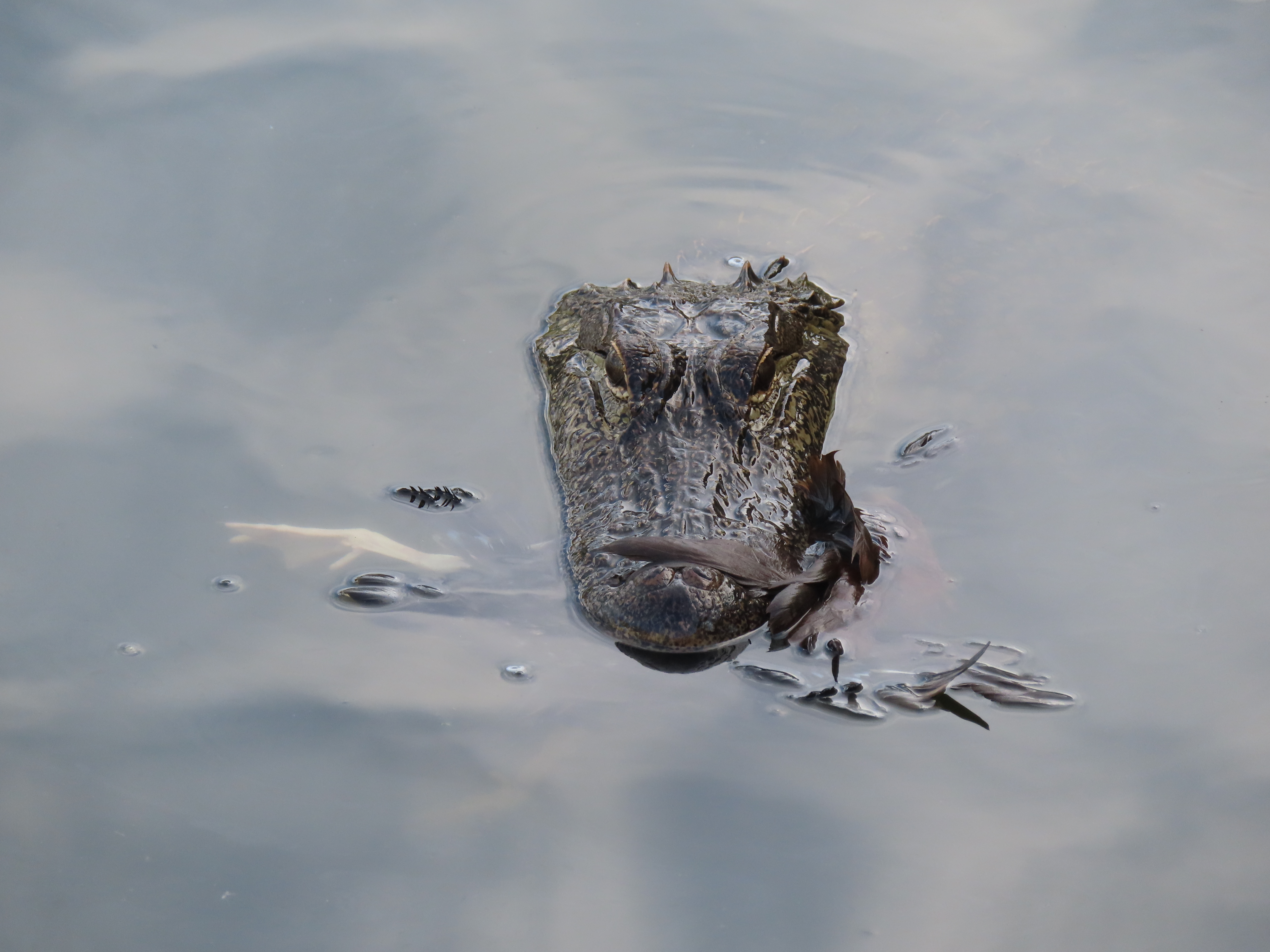 When I came upon the scene the alligator already had the dead bird in its mouth. I didn’t witness the alligator capture the bird, and for all I know it could have been scavenged. I stayed for about an hour and watched the alligator as I was hoping to get pictures of it swallowing the bird. But this never happened. Instead, the alligator just kept swimming around with the bird in its mouth. Several other people stopped to look and photograph the alligator while I was there. One of them commented: “It looks like a dog parading around with a bone in its mouth.” I thought this was an apt comment. It seemed as if the alligator was prominently displaying its prize for all to see. It was completely unphased by the presence of people. Actually, it was swimming in loops along the edge of the pond directly adjacent to the paved path where people were walking – as if it were showing off its catch. It would occasionally disappear under the water for a few minutes and then surface again with the bird.