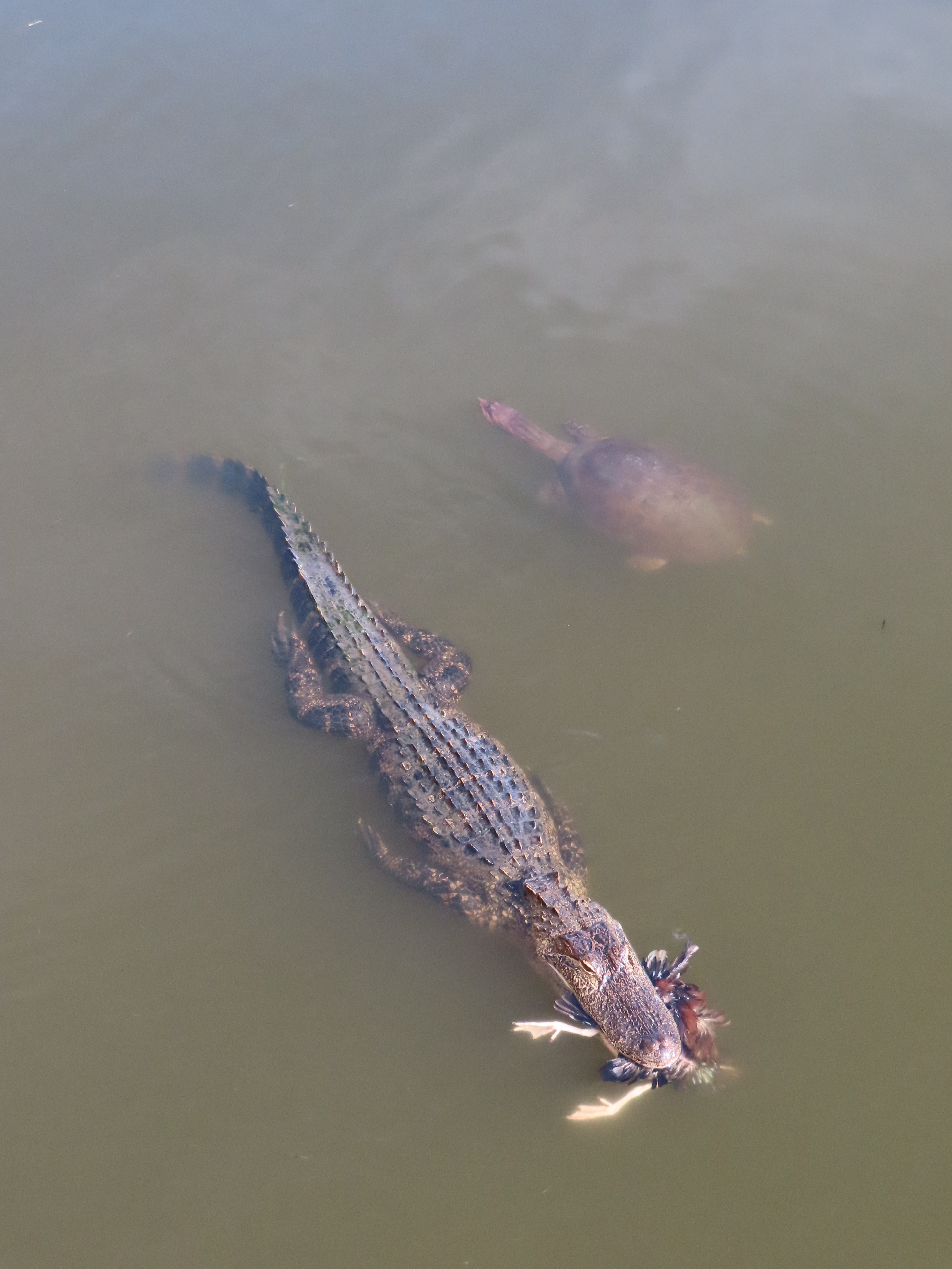 An alligator with a bird in its mouth is followed by a Florida softshell turtle. Click to enlarge photos.