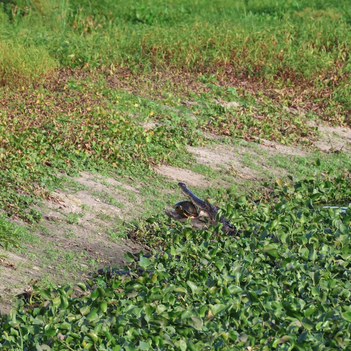 An alligator attempts to crush a Florida Red-bellied Cooter (Pseudemys nelsoni) in its jaws. It was unsuccessful and the turtle escaped. I took these two photos one second apart. Alligators have one of the strongest bite forces in the animal kingdom: 2,000 pounds per square inch (PSI). For comparisons, lions have a bite force of 600 PSI and humans 120 PSI. Yet when such force was applied to this turtle it slipped out of its jaws. I suspect the domed shell of the turtle strongly contributed to its survival, and a flat shelled turtle would be more likely to be crushed. This interpretation is supported by a study of River Cooters (Pseudemys concinna) which compared shell characterisitics of two populations in Alabama, one coastal population where alligators were present, and one inland population outside the range of alligators. 59% of adult turtles from the coastal population had alligator bite marks on their shells. They also had higher arching shells with the authors concluding “a highly arched shell may protect lower Gulf Coastal Plain populations of P. concinna from predation, especially when attacked by alligators in the smaller or medium size classes.”