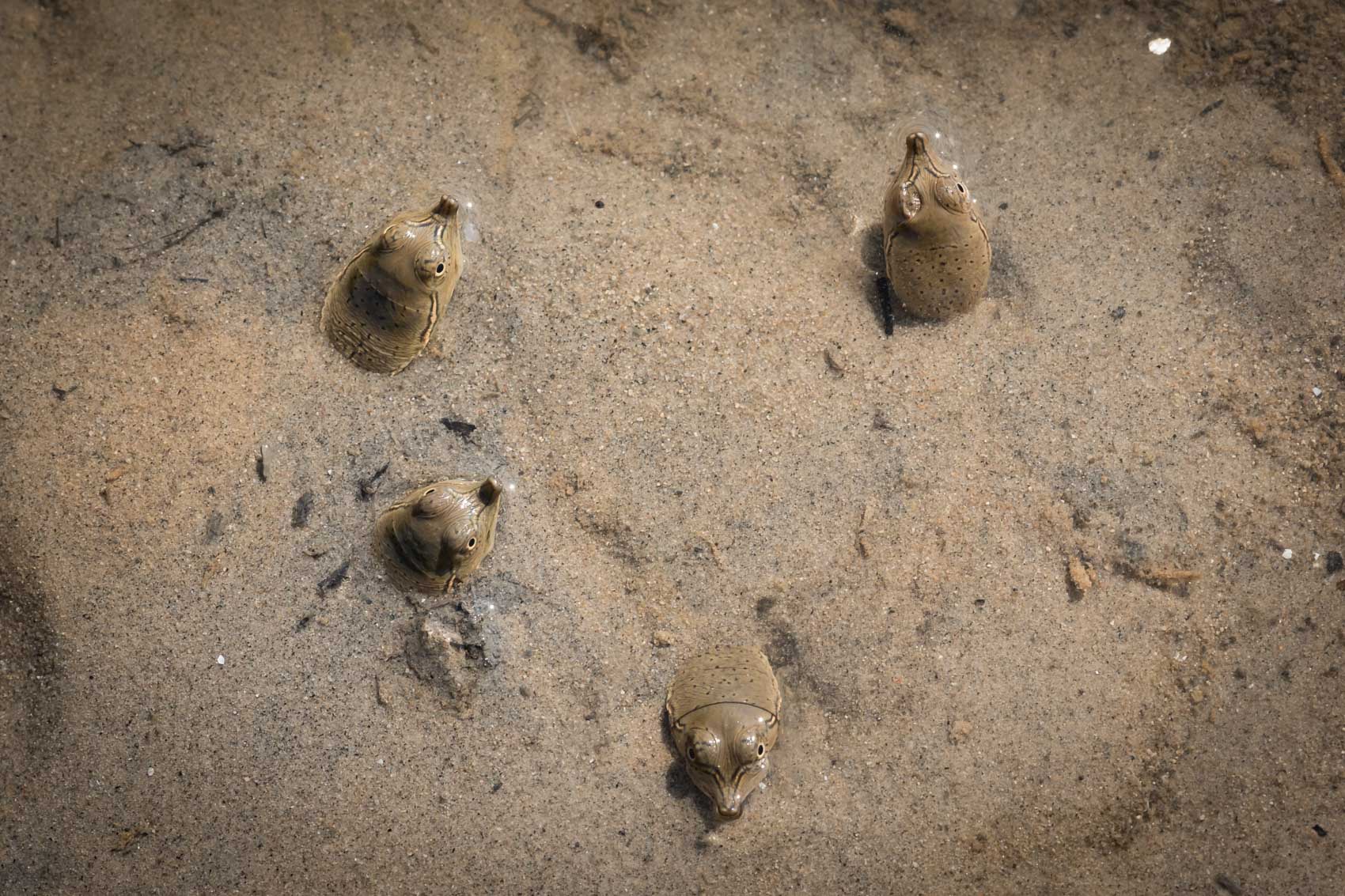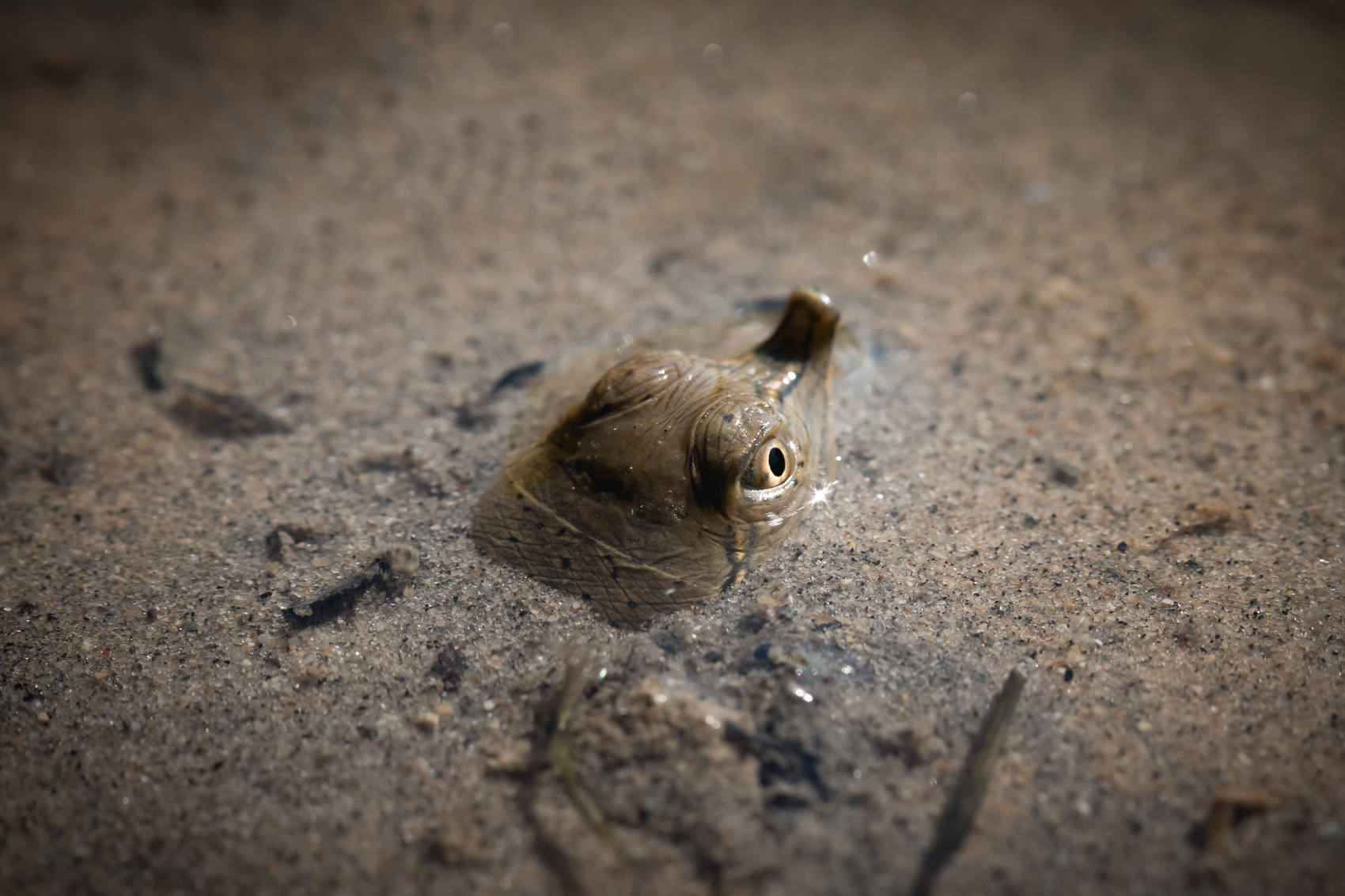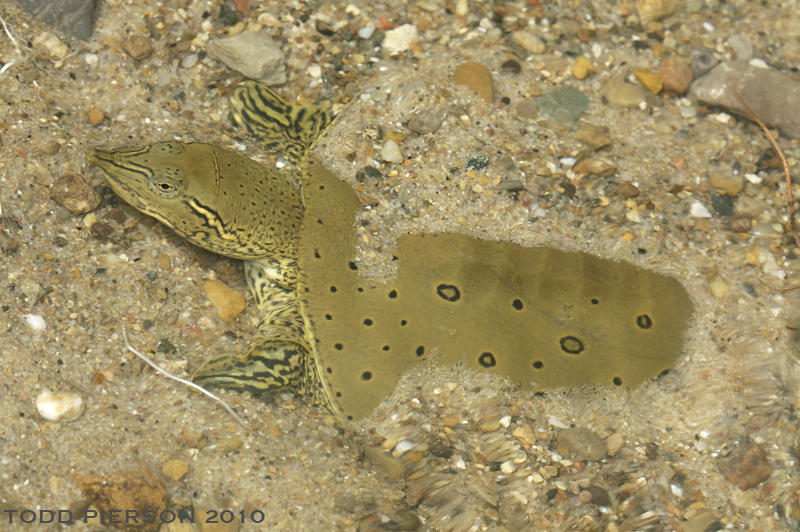 Spiny softshell turtles (Apalone spinifera) buried in the bottom substrate, similar to how flatfish such as flounder conceal themselves, as seen in the last photo. Photo credits: (1) Todd Pierson, (2) Phillip Colla, (3) & (4) Dave Coulson, (5) Andrew J. Martinez.