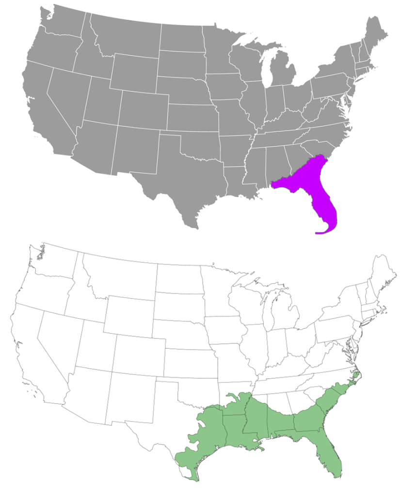 The geographic range of the Florida softshell turtle (purple) is entirely within that of the American alligator (green).