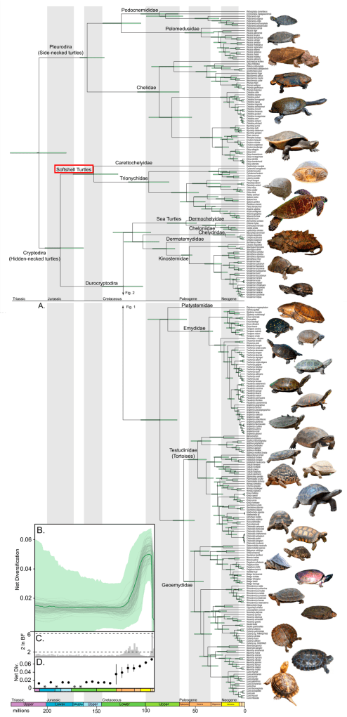 An evolutionary tree of turtles, taken from Thomson et al. (2021). The softshell turtle clade is indicated in red.