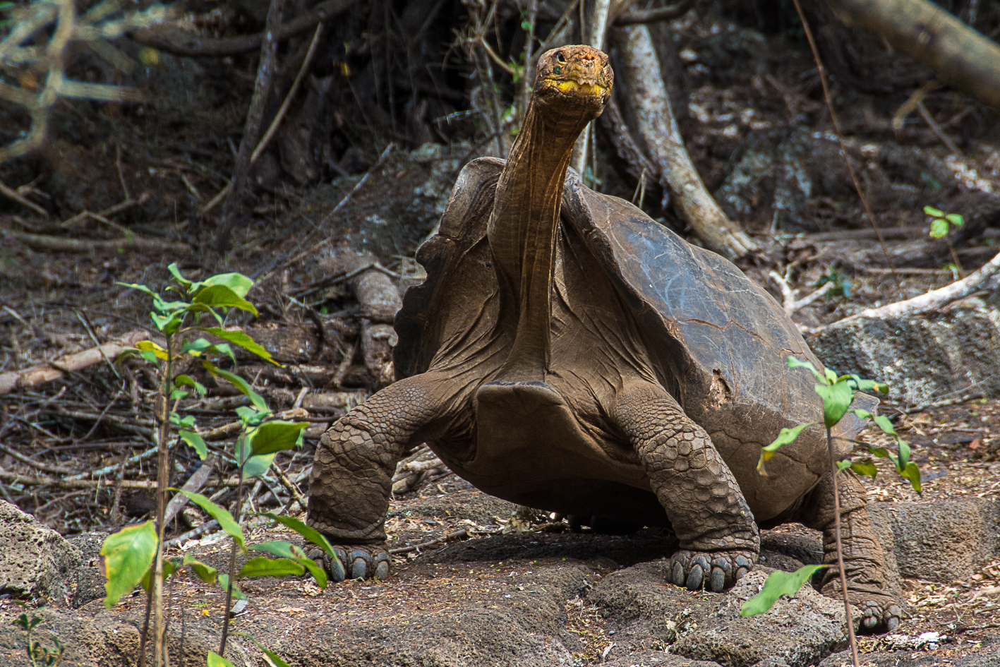 Contrasting shell shapes in Galapagos tortoises from different islands. The domed shell shape is associated with islands containing dense vegetation, and the saddleback shape with drier islands. This is likely to be adaptive. A domed shell could be advantageous for bulldozing through dense vegetation by increasing streamlining, while the greater neck reach of the saddleback shell would allow access to elevated shrubs when grazing. Photo credits: (1) Matthew Field, (2) Just Janza.