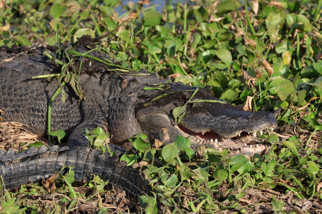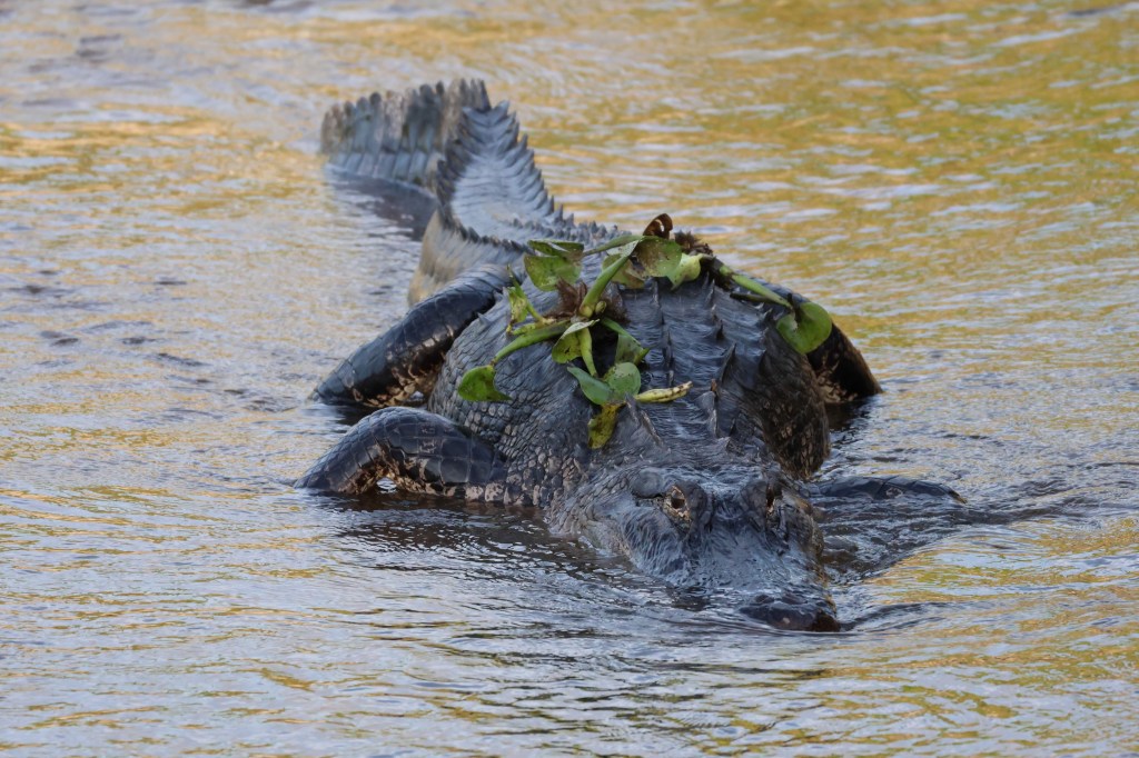 How: This massive alligator, adorned with water hyacinth, lied down in the shallow water with its head facing into the current. At this site, alligators often position themselves this way and wait for fish to pass close by.