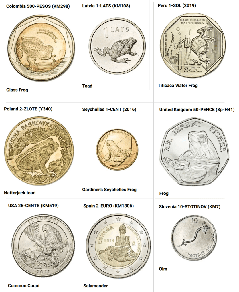 Only 9 coins depict amphibians (7 frogs and toads, and 2 salamanders).