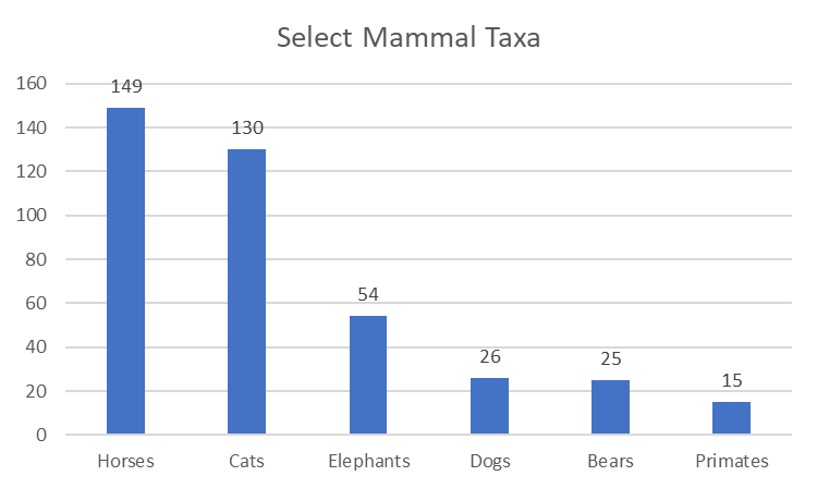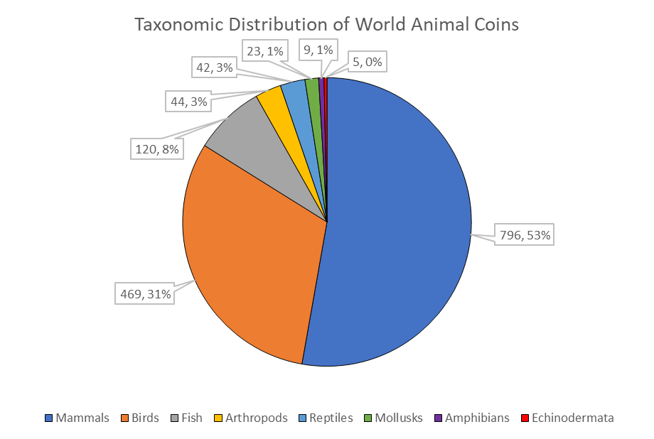 Daniel’s Coin Zoo lists just over 1,500 unique animal coins from across the world (limited to post-1900 circulation coins). More than half of these coins depict mammals (53%), about a third depict birds (31%), and only a small fraction (16%) depict all other animals (fish, Arthropods, reptiles, mollusks, amphibians, and Echinodermata or starfish).