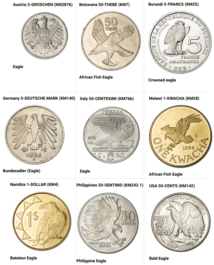 Interestingly, there are coins which depict such evolutionary rarities as the Coelacanth (an ancient lineage of lobe-finned fishes thought extinct until its discovery in the 1930s in the Indian Ocean), the Tuatara (a major category of reptiles represented by a single species found on New Zealand), and the Platypus (one of only two egg-laying mammal species – Monotremes – along with the Echidna, which is also depicted on an Australian coin). This seems evidence that countries tend to recognize and celebrate the fauna which makes them unique. I will however note a few gaps. There are no coins which depict Hagfish, Lamprey, Lungfish, or Caecilians. All these taxa have somewhat eel-like body shapes, so perhaps not the most charismatic fauna to put on a coin.