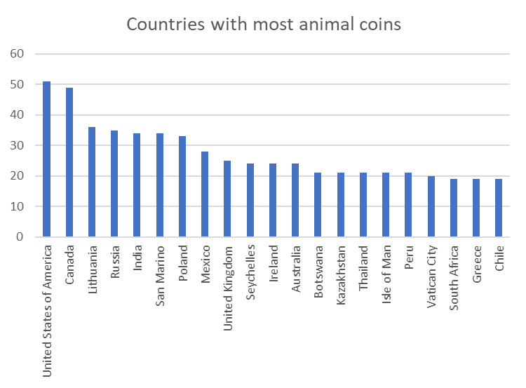 Different countries vary greatly in how many animal coins they have minted.
