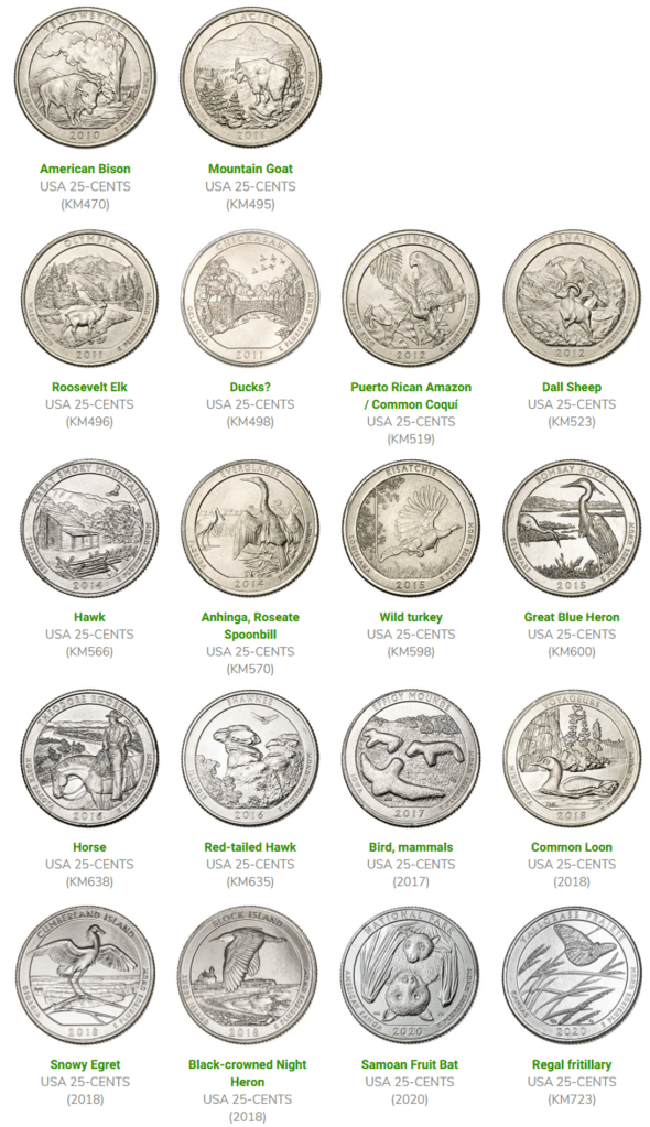 Up until recently, the U.S.A. had relatively few animal coins (a few eagles on various denominations, and the buffalo nickel). But the advent of the state quarter program, and later the national parks quarter program really boosted the numbers – to the point that the U.S. has the most animal coins of any country.