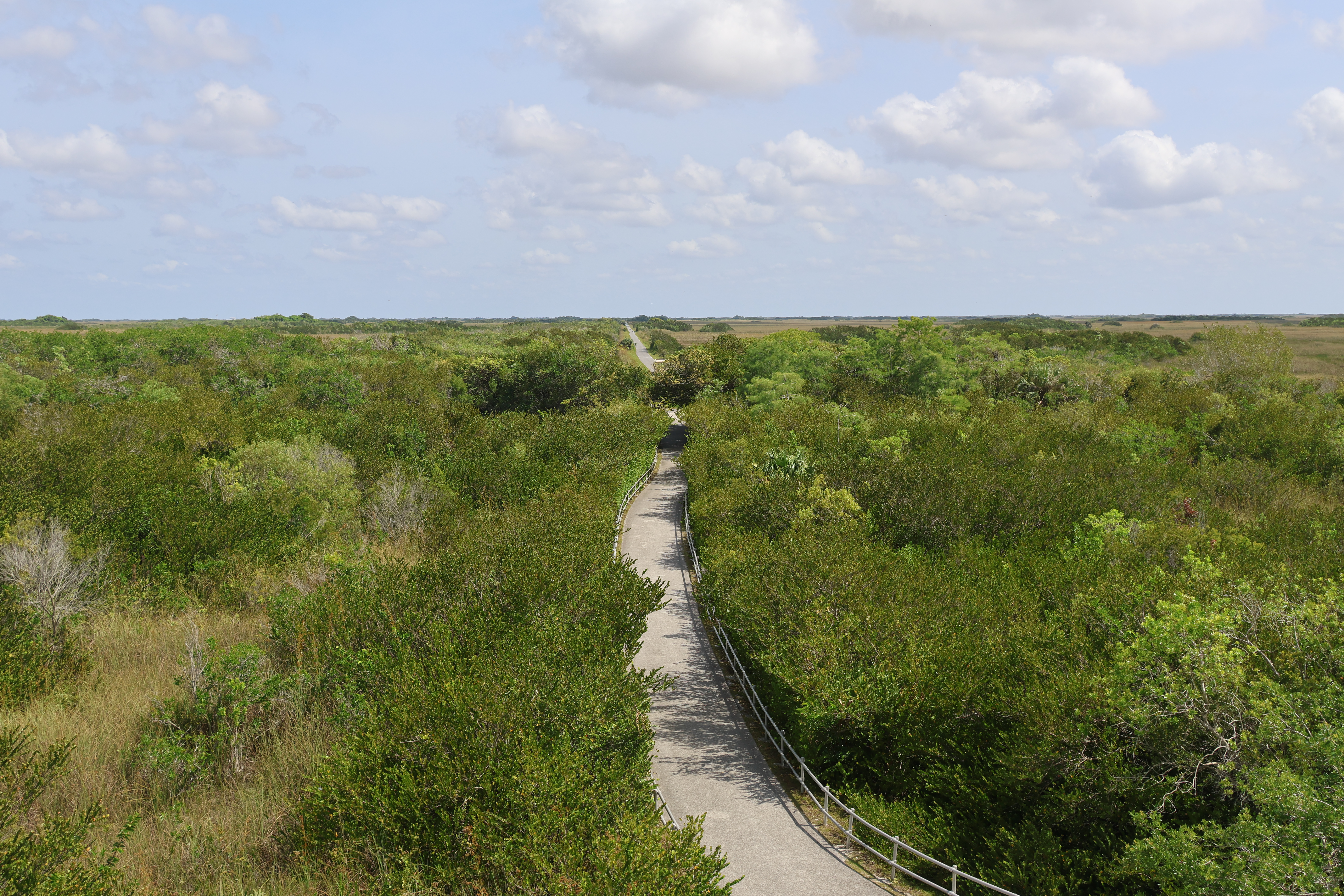I started out by biking the 15-mile Shark Valley Trail in the heart of the Everglades. A shallow ditch runs along either side of this paved trail and this ditch retains water when the rest of the landscape is dry. As a result, fish, alligators, turtles, birds, insects, and other wildlife congregate on either side of the trail. A few alligators were even poking their heads out from culverts that passed underneath the trail. The trail culminates in an observation tower giving expansive views over the Everglades ‘sea of grass’.