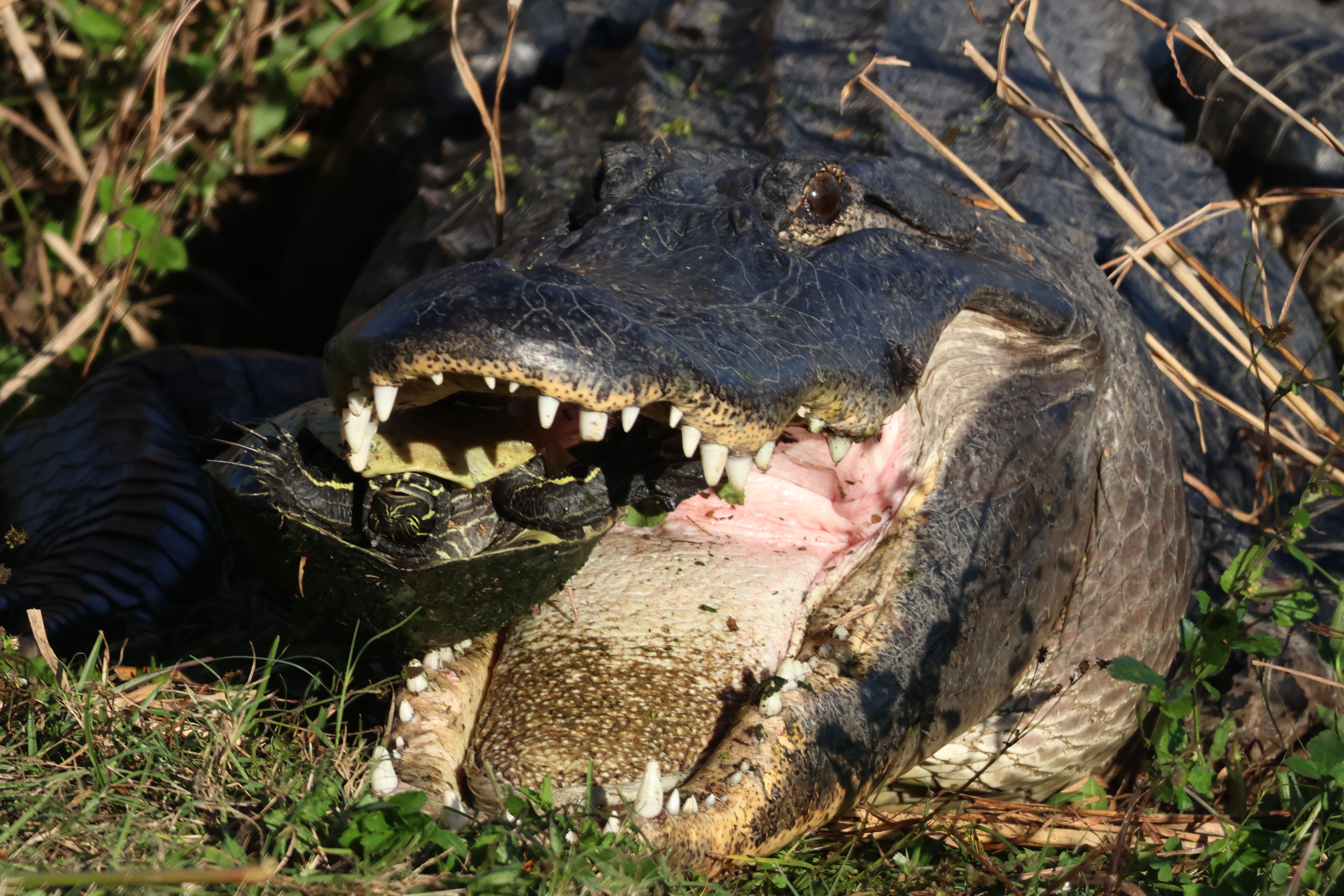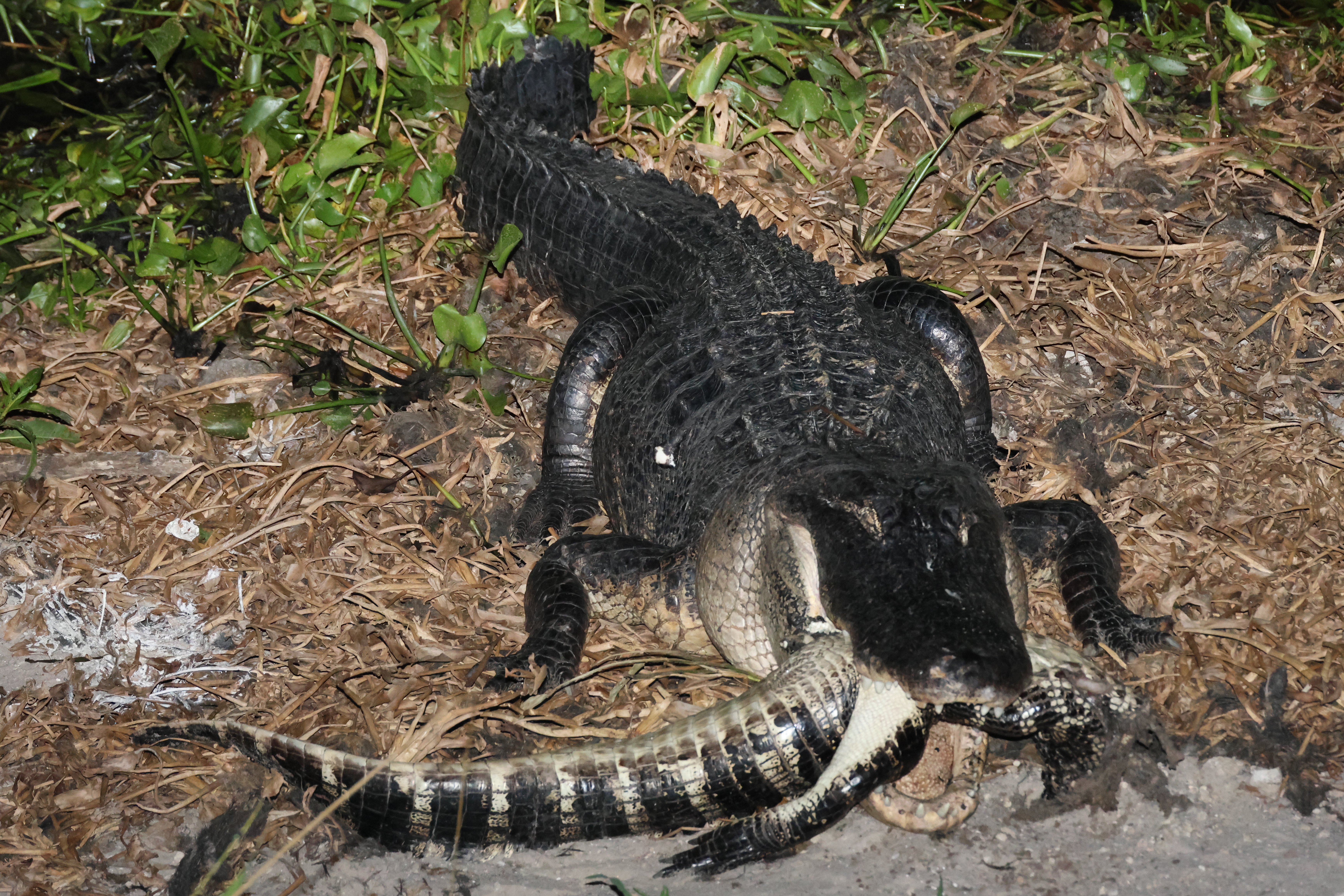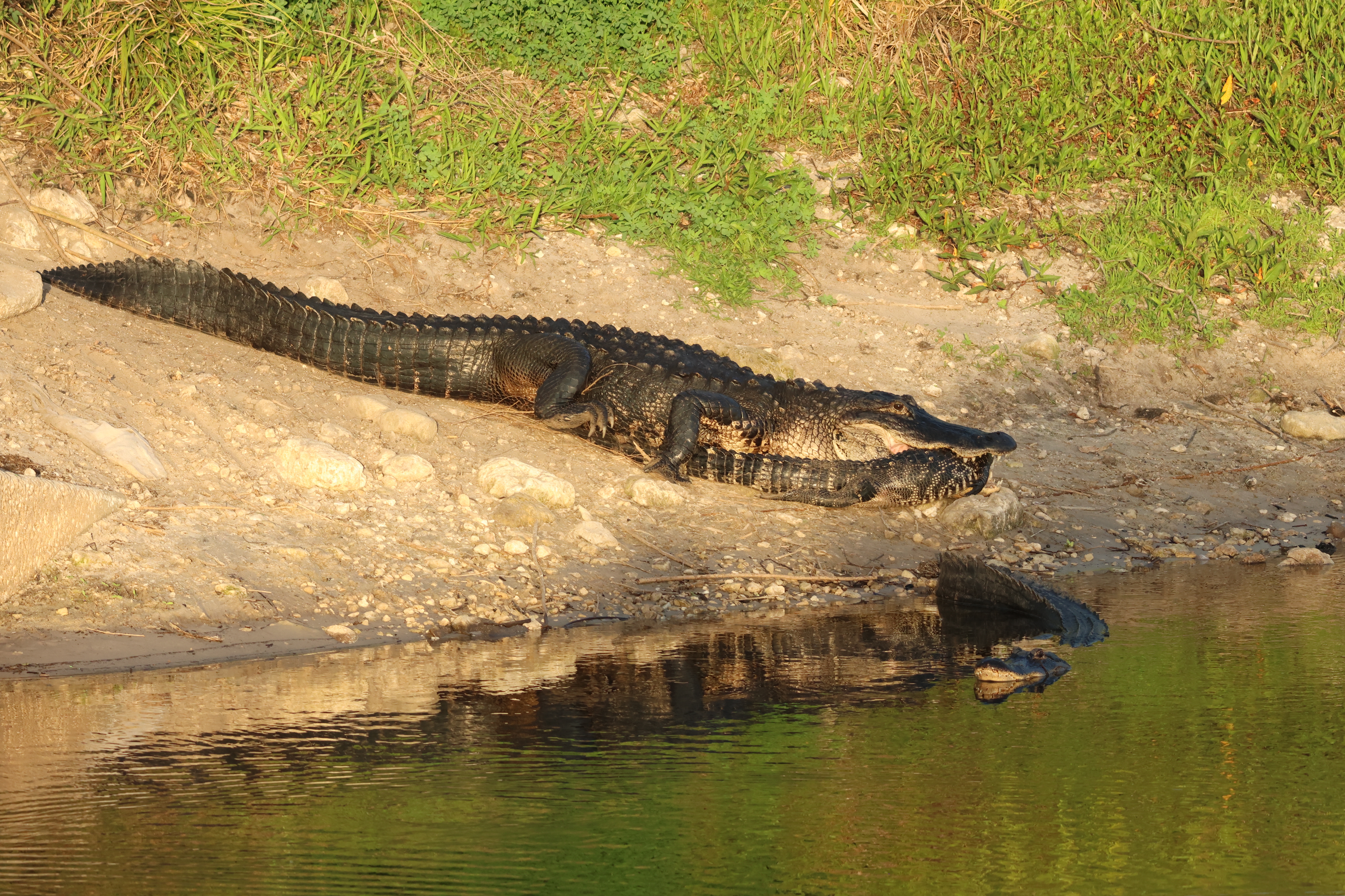 Natural history notes: The first time I witnessed a large alligator eating a small alligator I thought this was likely to be a very rare occurrence. That turned out not to be the case at all. I have since seen this happen on six separate occasions, including twice in the same evening. In each instance, I came upon a larger alligator with an already dead smaller alligator clutched in its jaws. The swallowing of such large prey takes a long time, frequently involves moving locations while dragging or swimming with the smaller alligator clutched in the jaws, and sometimes involves violent thrashing to try to rip off chunks which are more easily swallowed. I have seen large alligators attempt to consume Cooters (hard-shelled, fairly large, aquatic turtles in the genus Pseudemys) on three occasions, and twice successfully. In each instance the alligator emerged from the water with a turtle in its mouth, and moved some ways onto shore. It then proceeded to manipulate the turtle in its jaws, often flipping the turtle upside down, sometimes dropping the turtle and then picking it up again. Eventually, a series of crushing bites were delivered which broke the shell, after which the turtle was swallowed whole in a single motion. Twice I have seen alligators preying upon Florida softshell turtles. In one instance an alligator was seen swimming with a Florida softshell turtle in its mouth, and in the other an alligator was resting next to a dead Florida softshell turtle (which it may have been scavenging).