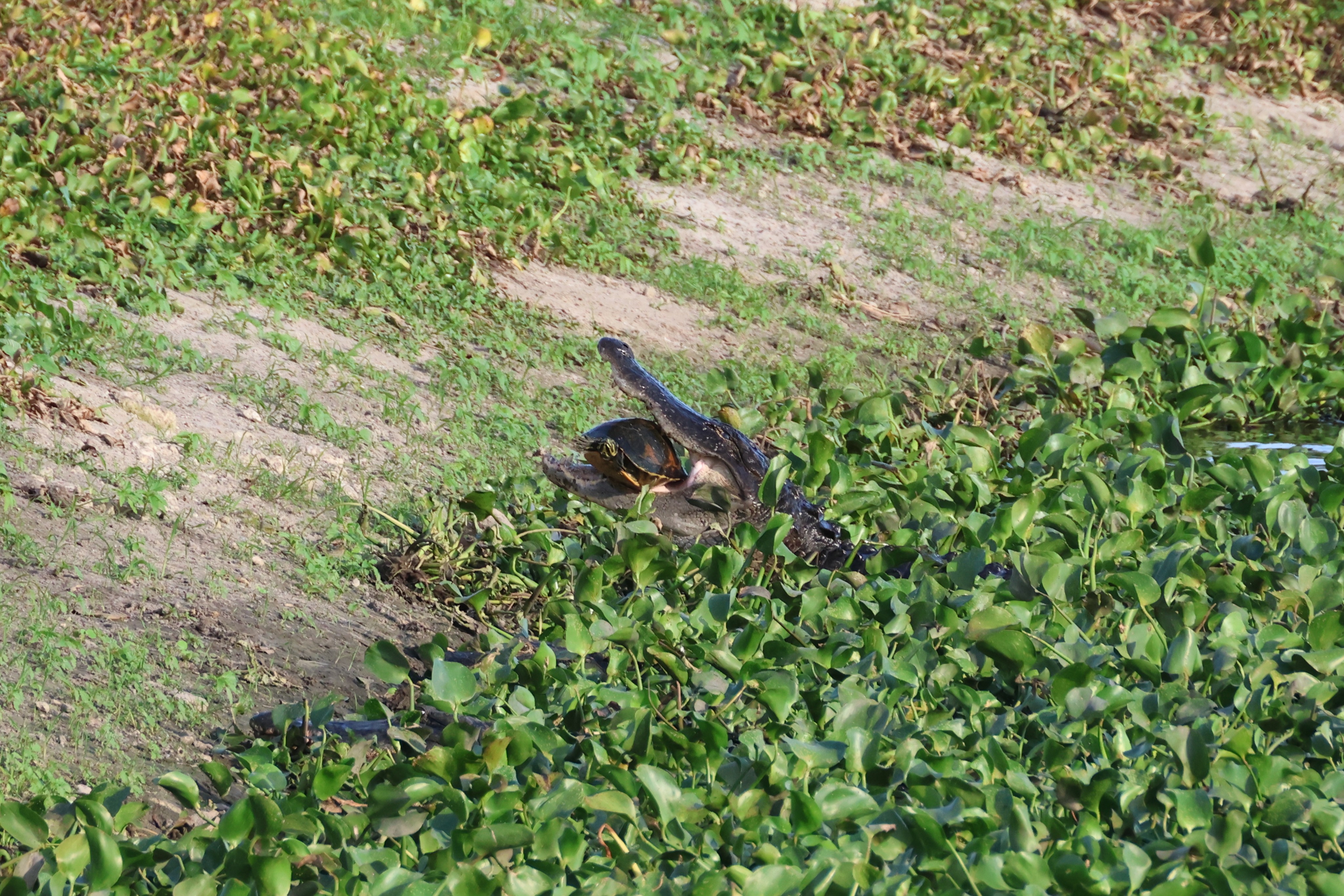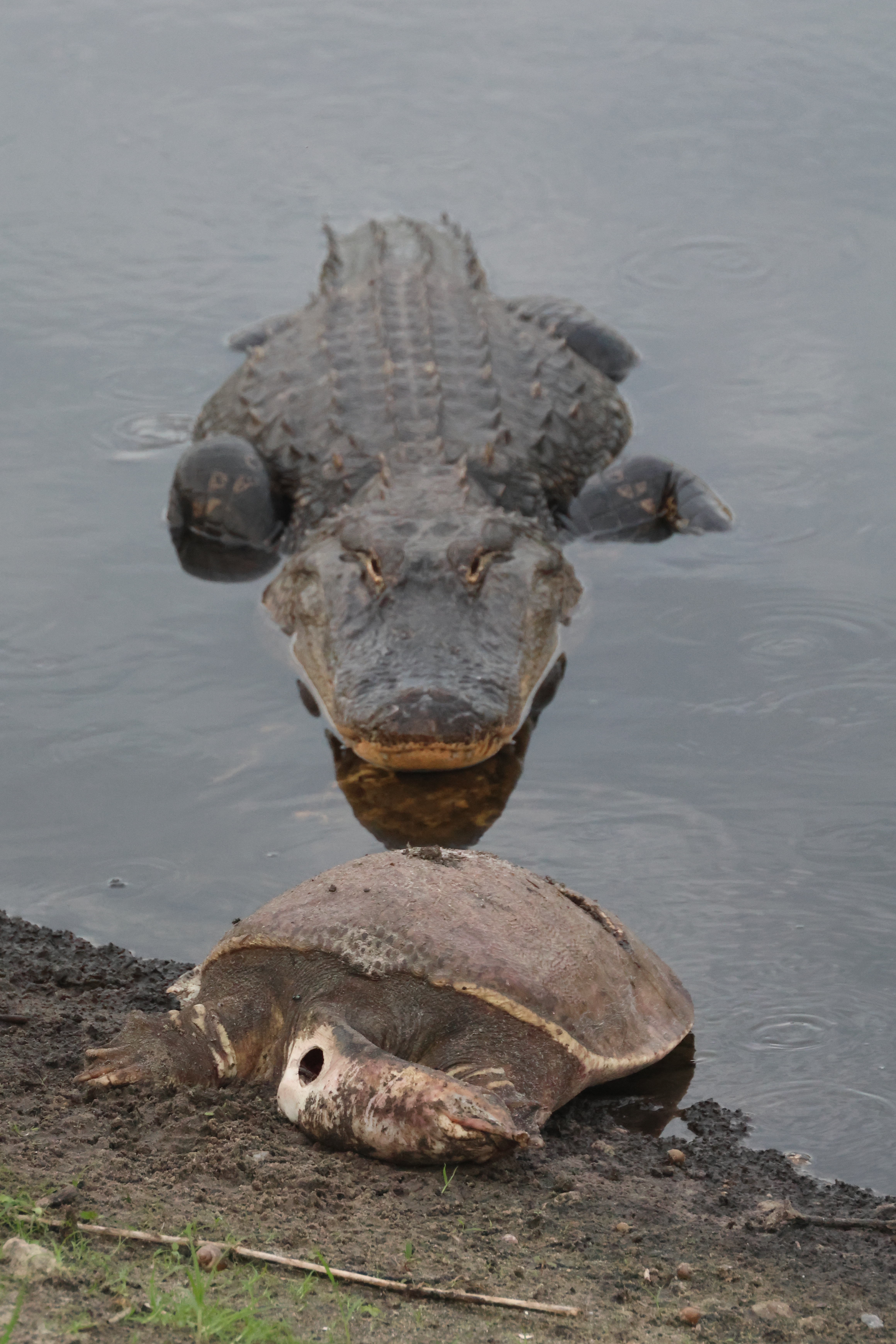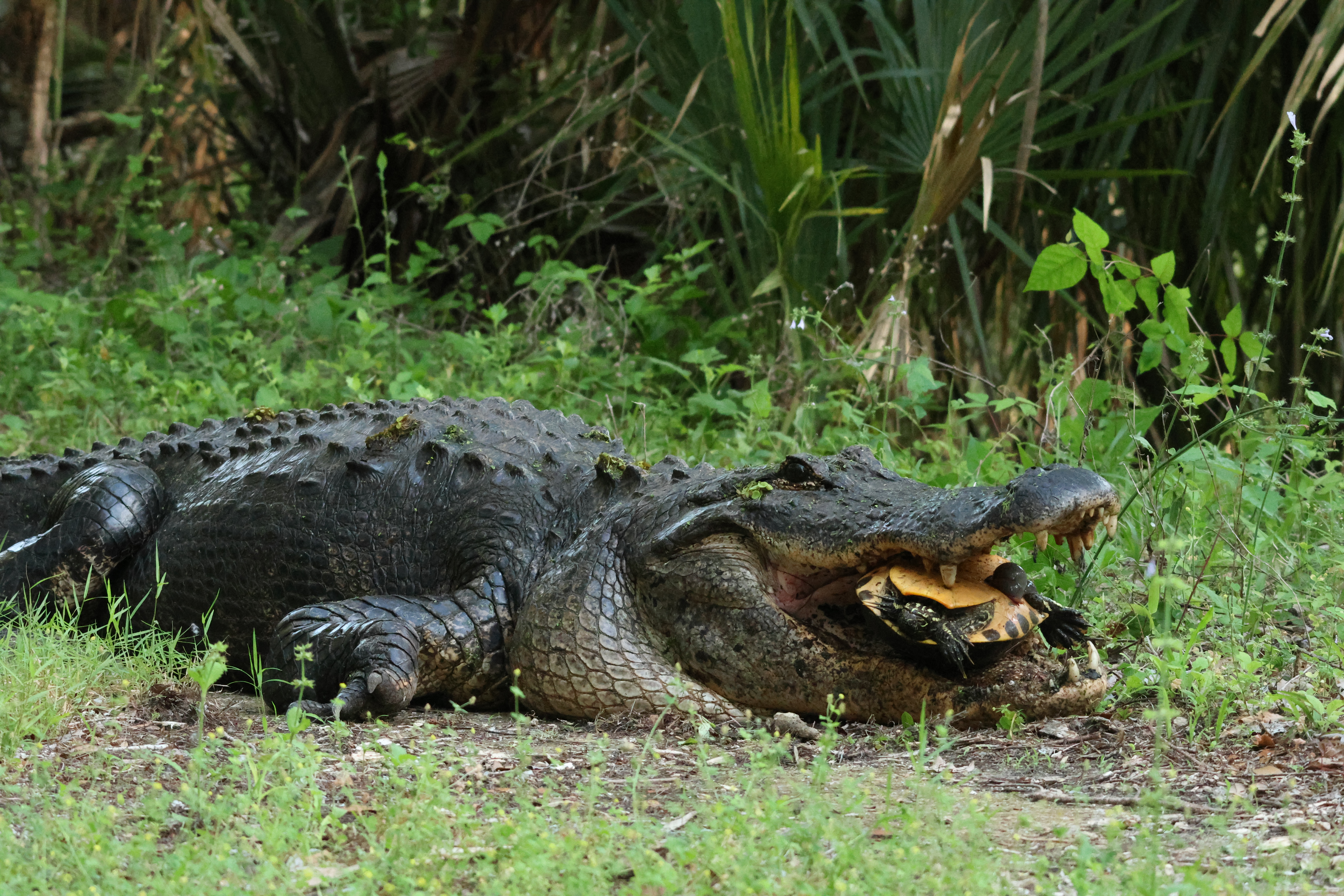 Natural history notes: The first time I witnessed a large alligator eating a small alligator I thought this was likely to be a very rare occurrence. That turned out not to be the case at all. I have since seen this happen on six separate occasions, including twice in the same evening. In each instance, I came upon a larger alligator with an already dead smaller alligator clutched in its jaws. The swallowing of such large prey takes a long time, frequently involves moving locations while dragging or swimming with the smaller alligator clutched in the jaws, and sometimes involves violent thrashing to try to rip off chunks which are more easily swallowed. I have seen large alligators attempt to consume Cooters (hard-shelled, fairly large, aquatic turtles in the genus Pseudemys) on three occasions, and twice successfully. In each instance the alligator emerged from the water with a turtle in its mouth, and moved some ways onto shore. It then proceeded to manipulate the turtle in its jaws, often flipping the turtle upside down, sometimes dropping the turtle and then picking it up again. Eventually, a series of crushing bites were delivered which broke the shell, after which the turtle was swallowed whole in a single motion. Twice I have seen alligators preying upon Florida softshell turtles. In one instance an alligator was seen swimming with a Florida softshell turtle in its mouth, and in the other an alligator was resting next to a dead Florida softshell turtle (which it may have been scavenging).