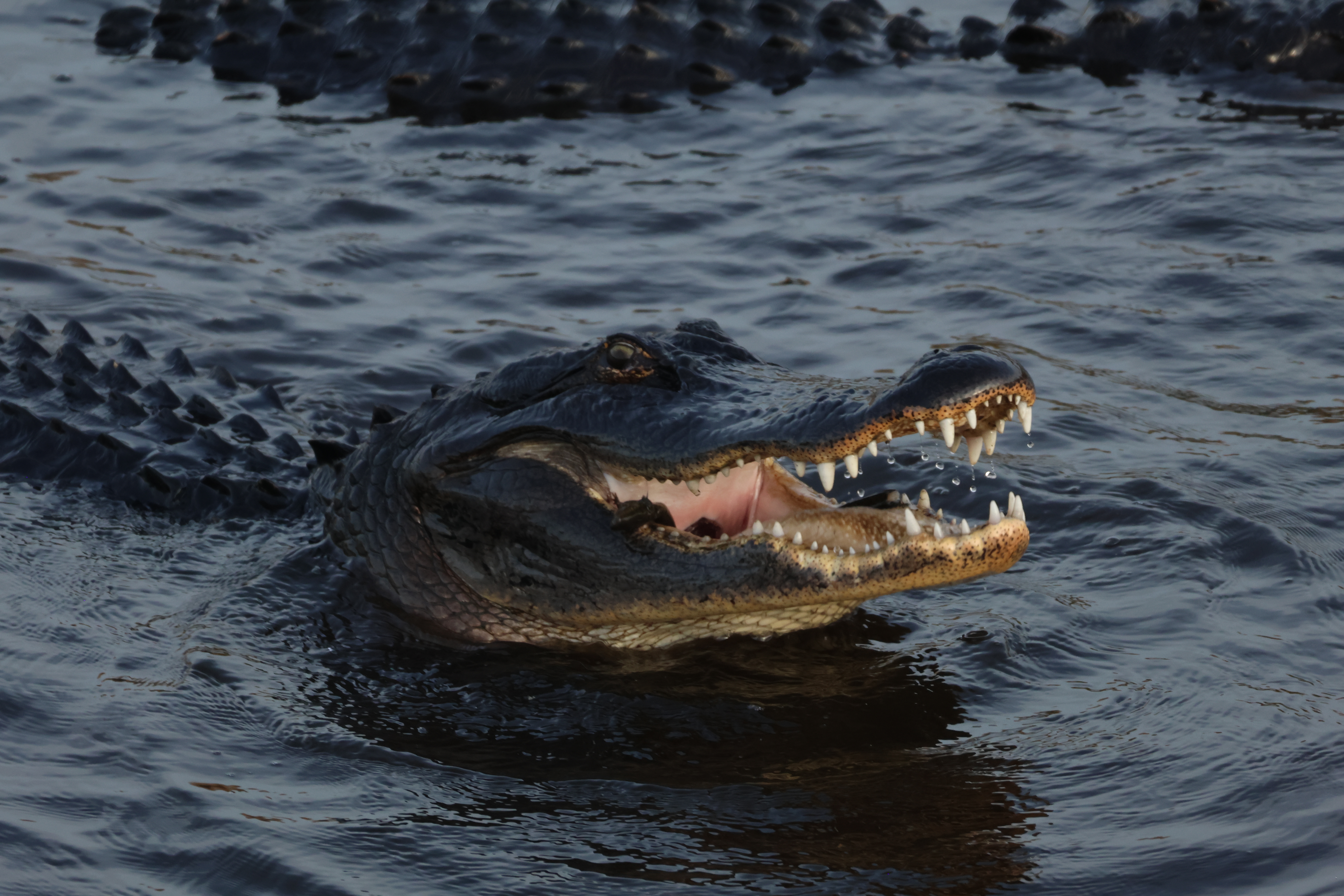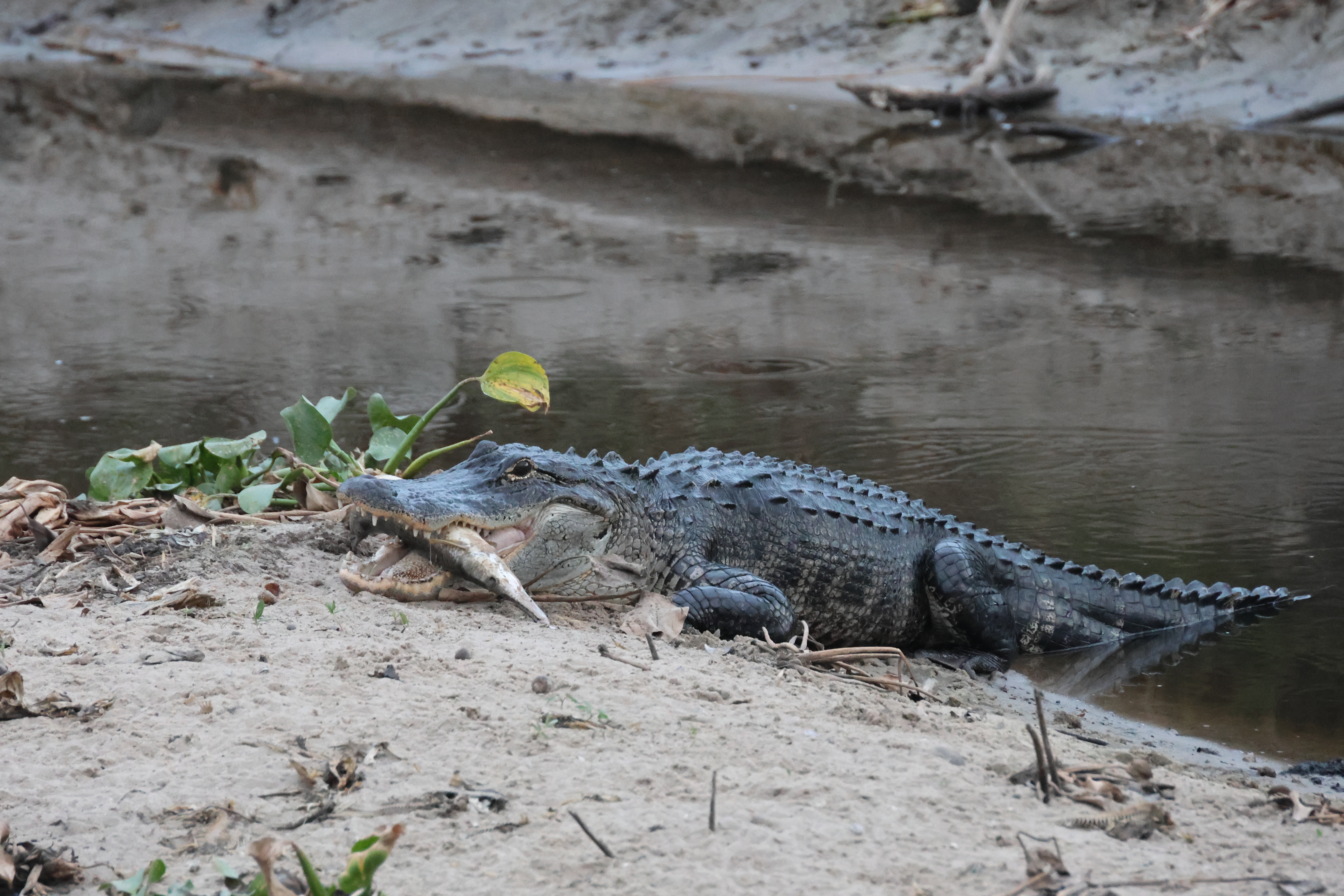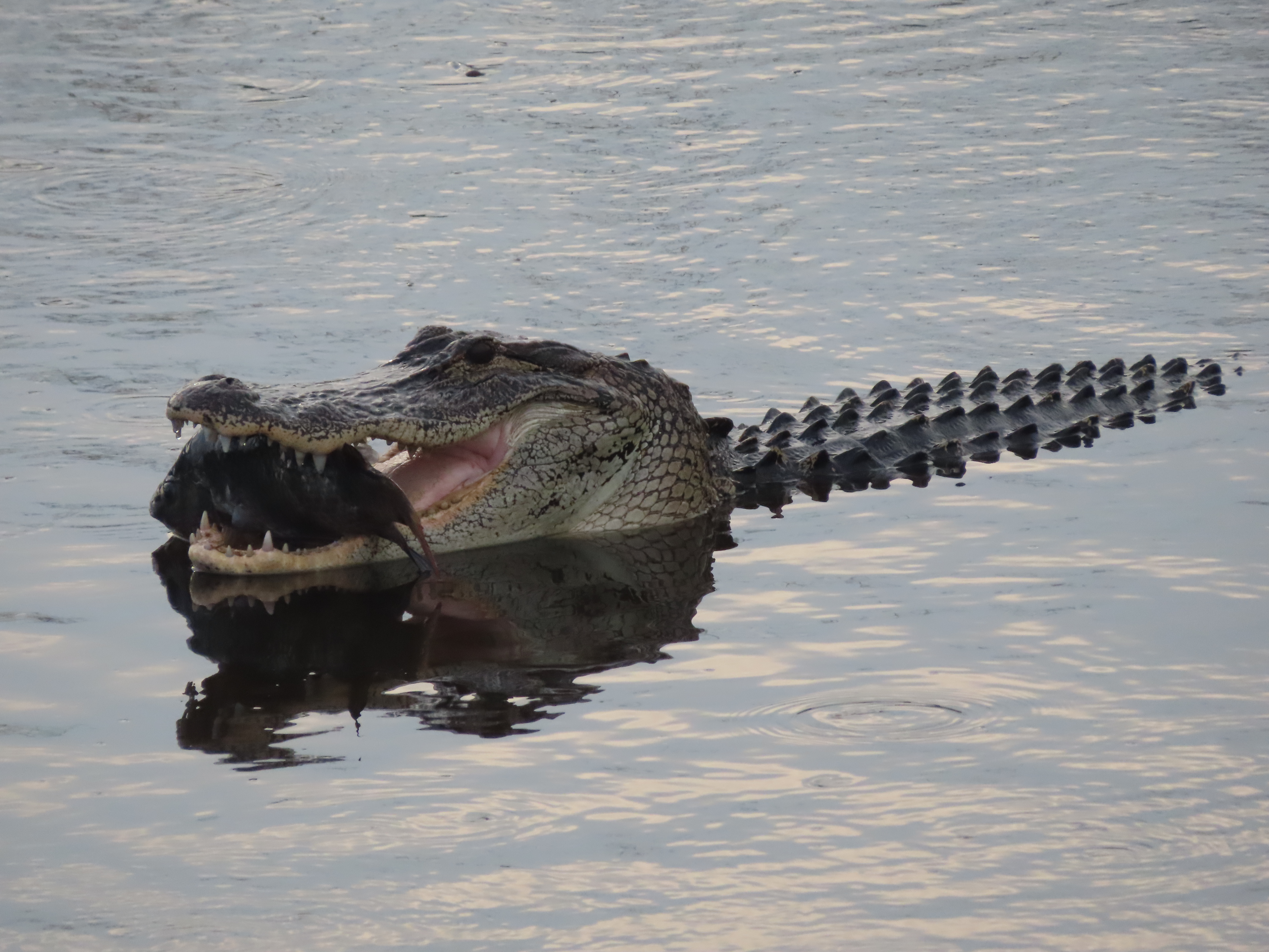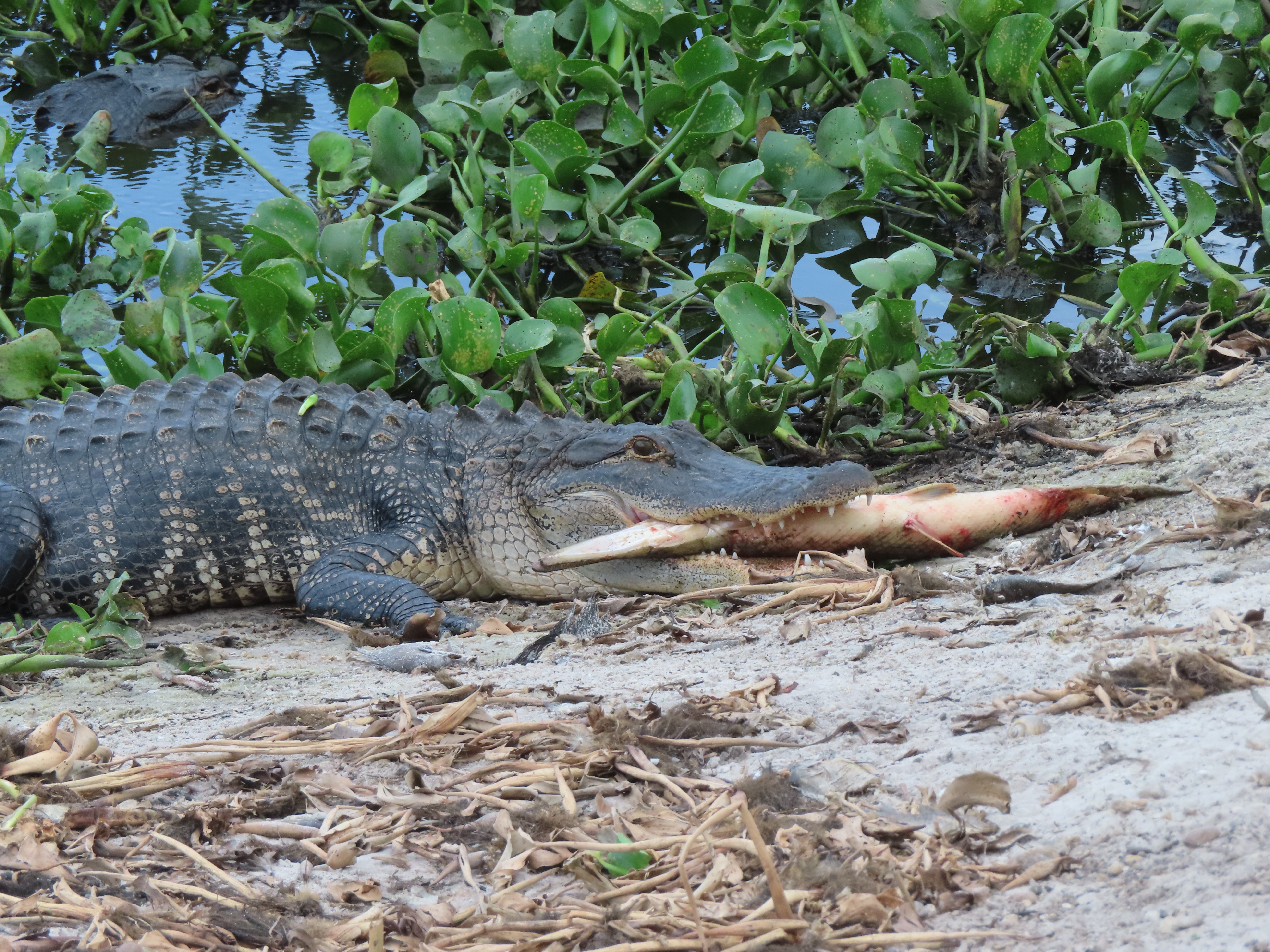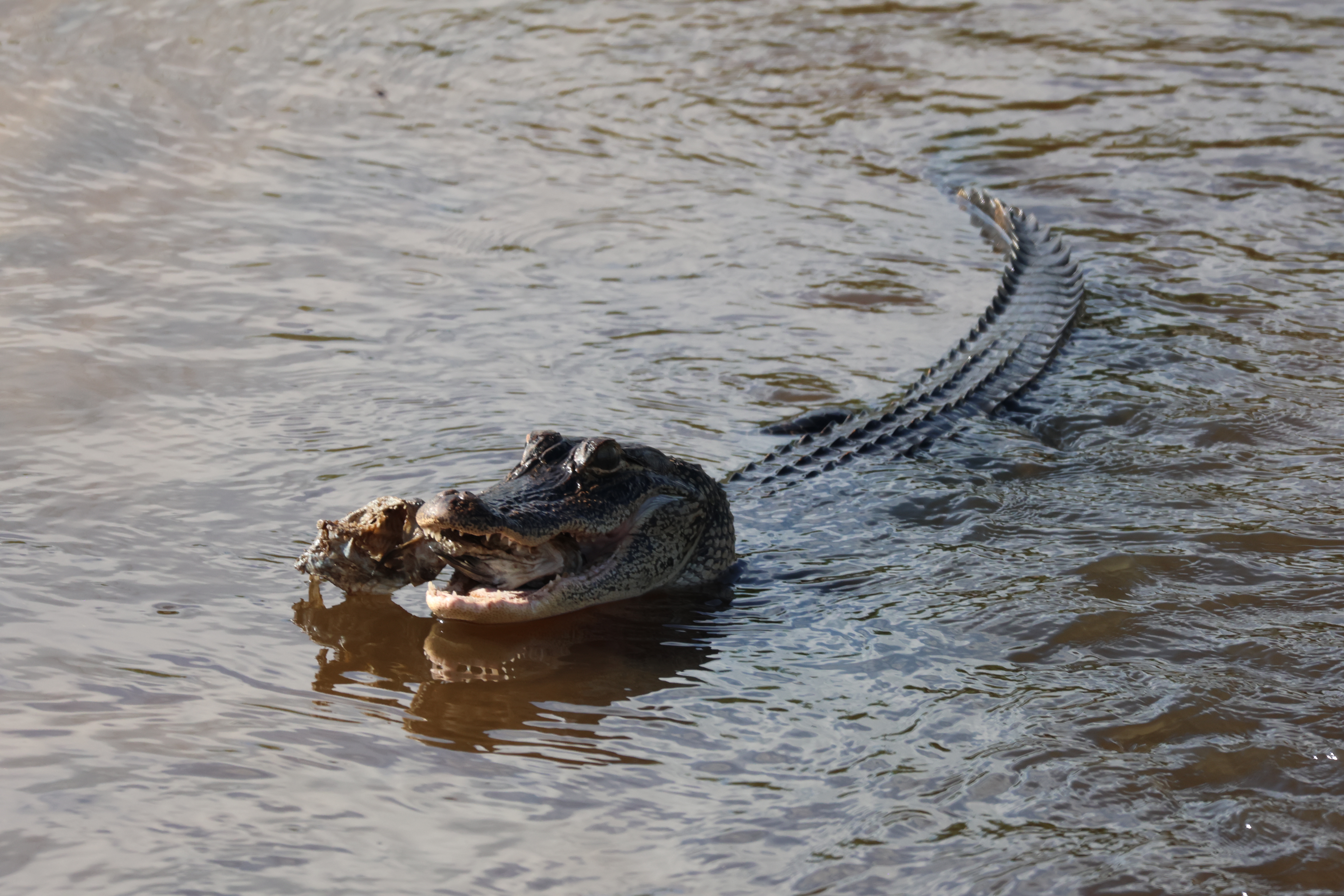 That completes the list of items I have seen alligators eat. This list is obviously not a replacement for the analysis of stomach contents, and such a list is likely to be biased in two obvious ways. The first is that my observations have so far been limited to the daytime. Alligators reportedly hunt primarily at night. So what alligators are capturing and eating at night is likely missing from the above list. Second, my list is likely to be biased toward larger prey. It can be difficult to observe alligators eating smaller prey, and smaller prey is quickly swallowed with minimal processing time. In contrast, large prey items are more obvious to see, and can take a long time to process before it can be swallowed. This latter point is important because in most of the above photographs I did not witness the alligator actually capture the prey item (with the exception of some of the fish), but instead came upon the alligator with the already dead prey item in its mouth. Smaller prey items, that don’t require ripping into smaller chunks, would presumably have been swallowed whole soon after capture. This means that the prey I observed alligators carrying in their jaws is likely to be biased toward the subset which could not be immediately swallowed due to its larger size.