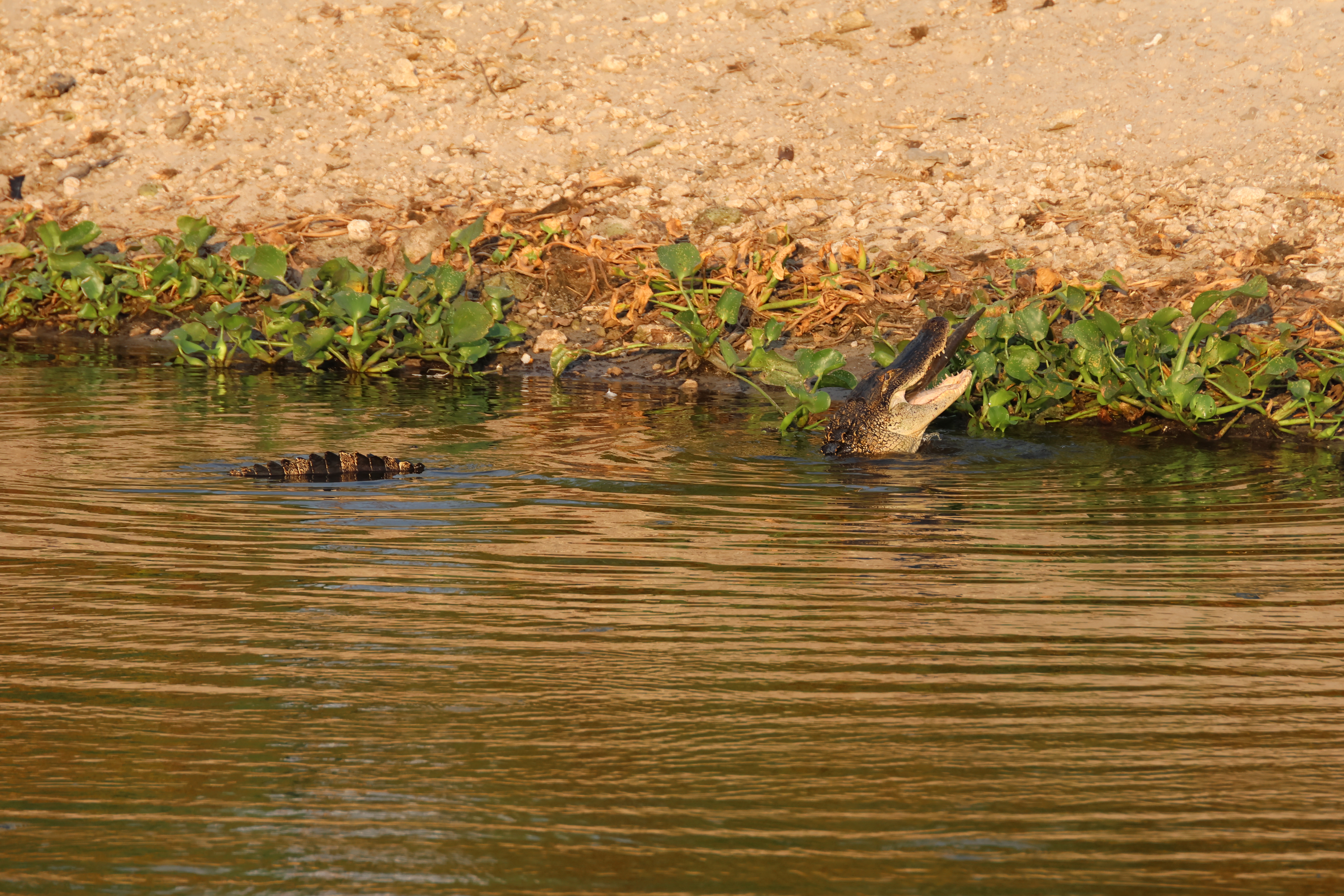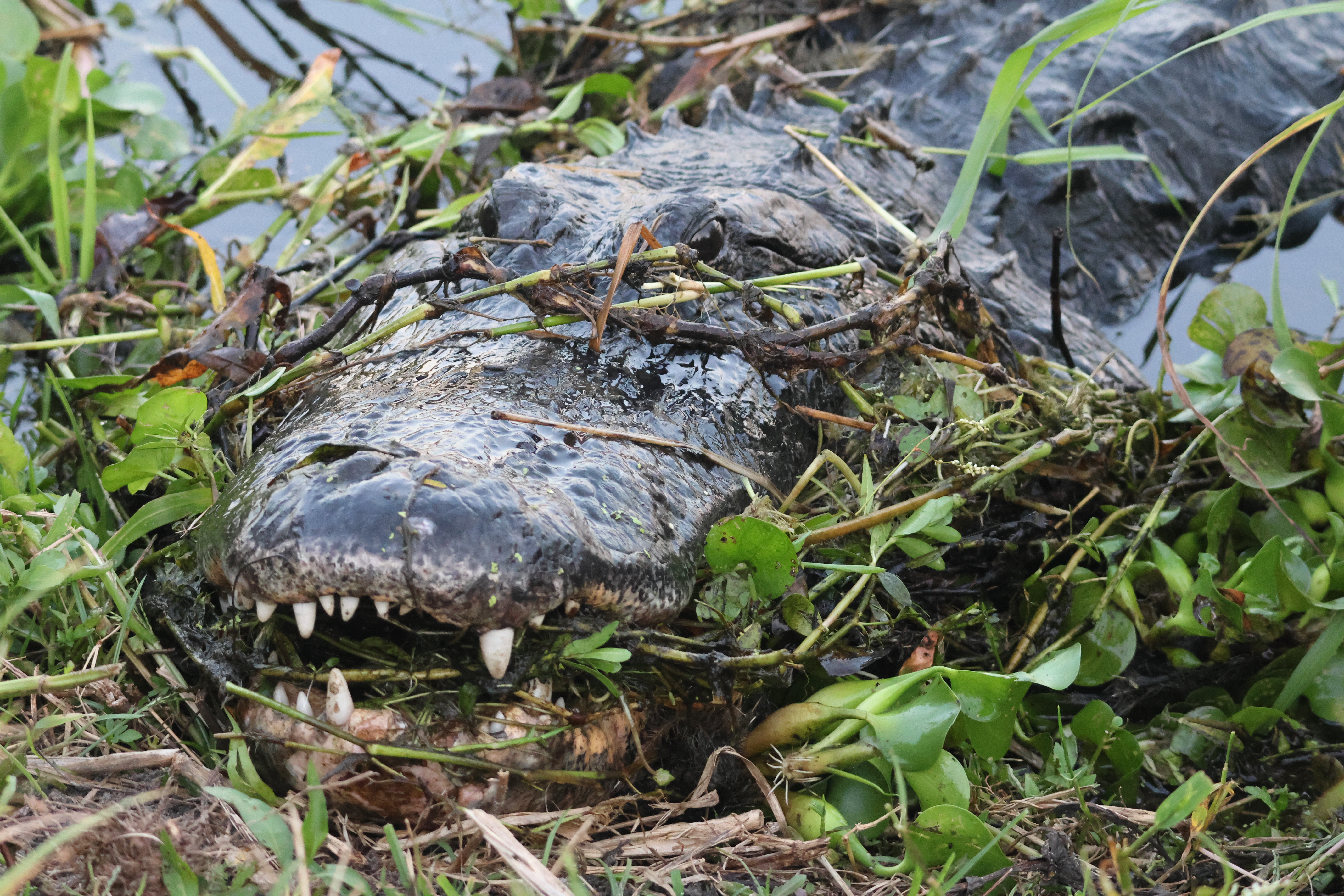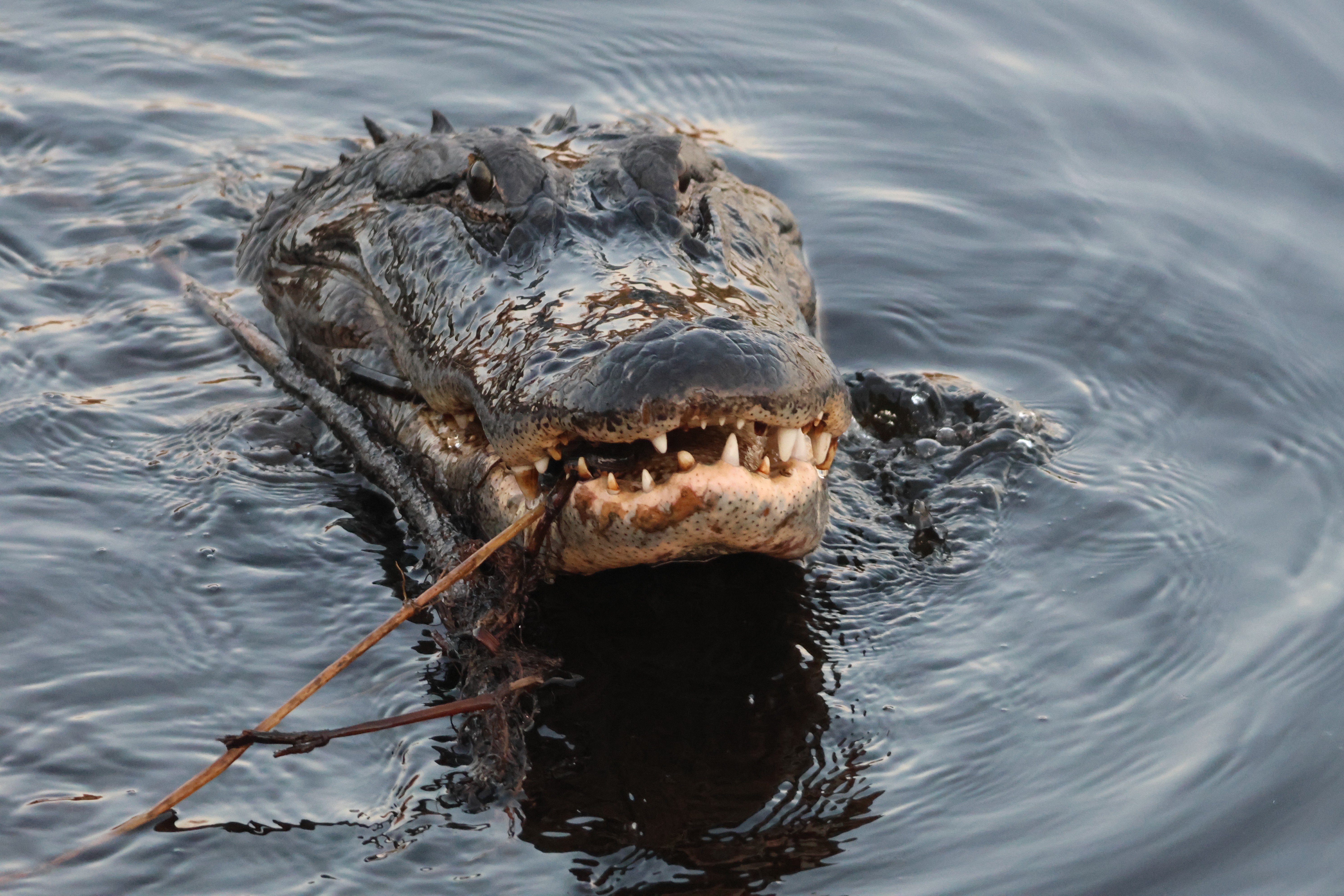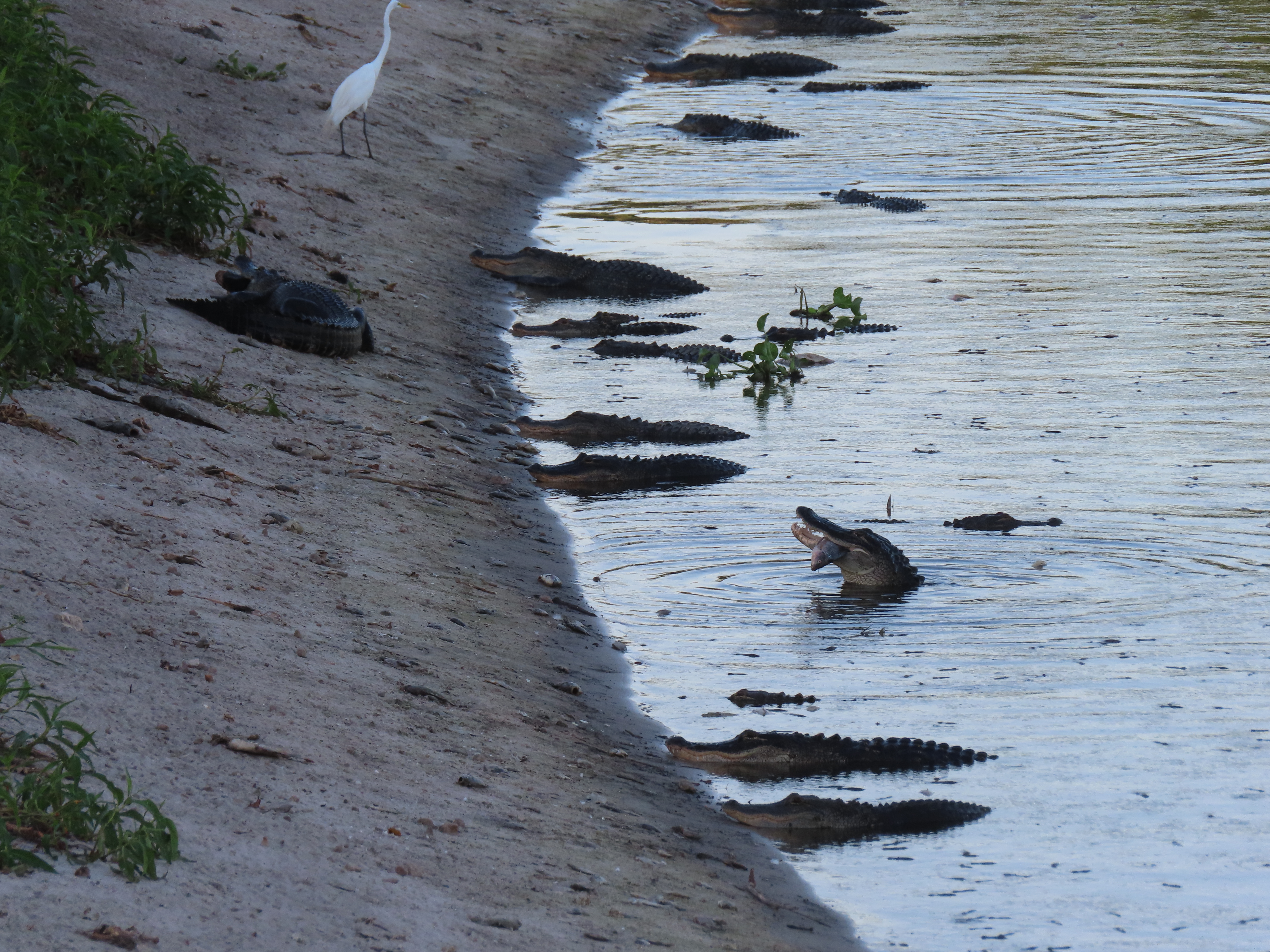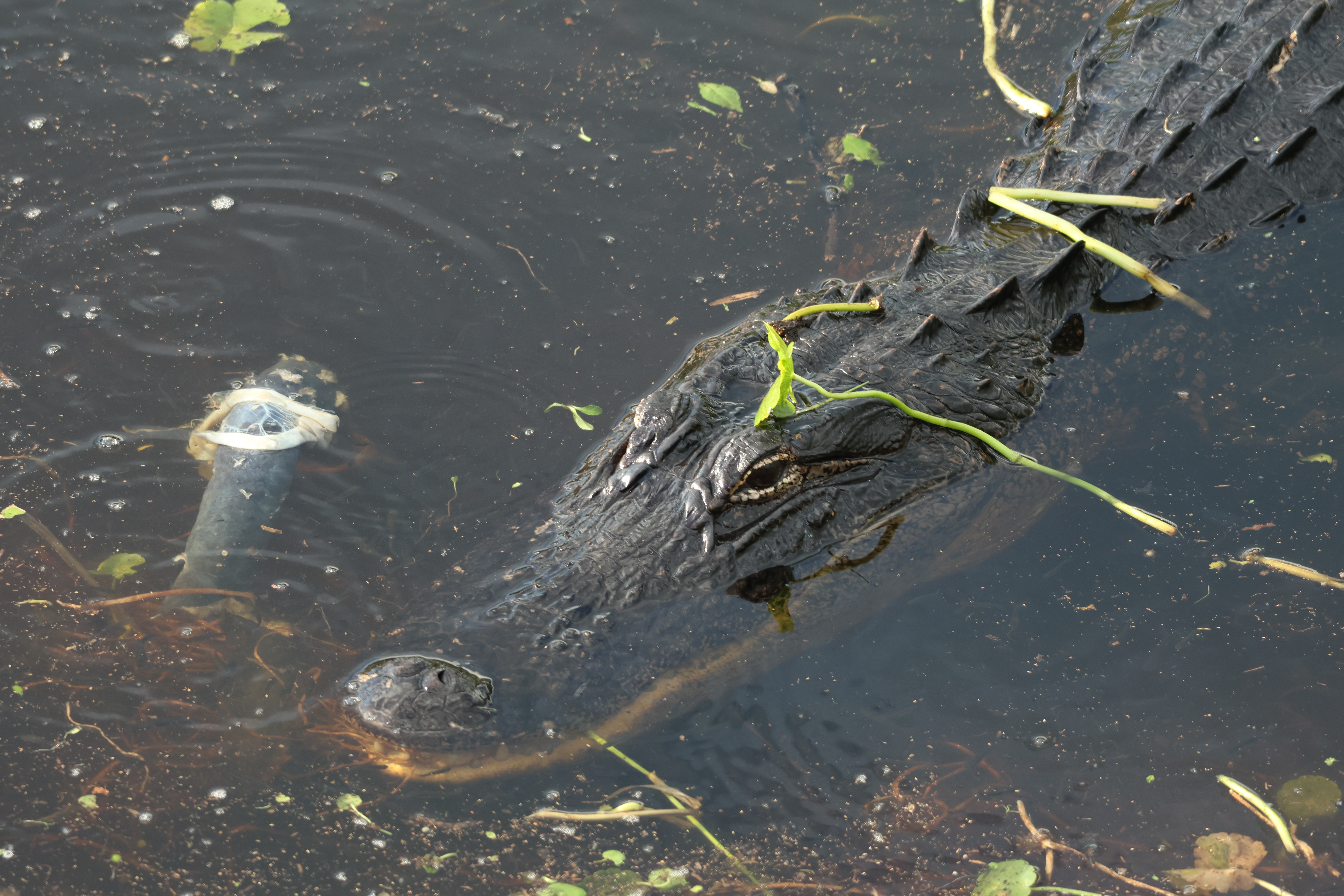 Natural history notes: I once saw an alligator appear to eat a stick. It may have accidently eaten the stick while trying to swallow some other prey item, but I couldn’t see any other prey in its mouth. I also once saw an alligator emerge onto shore with a mouthful of aquatic vegetation. It appeared to have swam through thick vegetation with its mouth open and not bothered to remove this.
