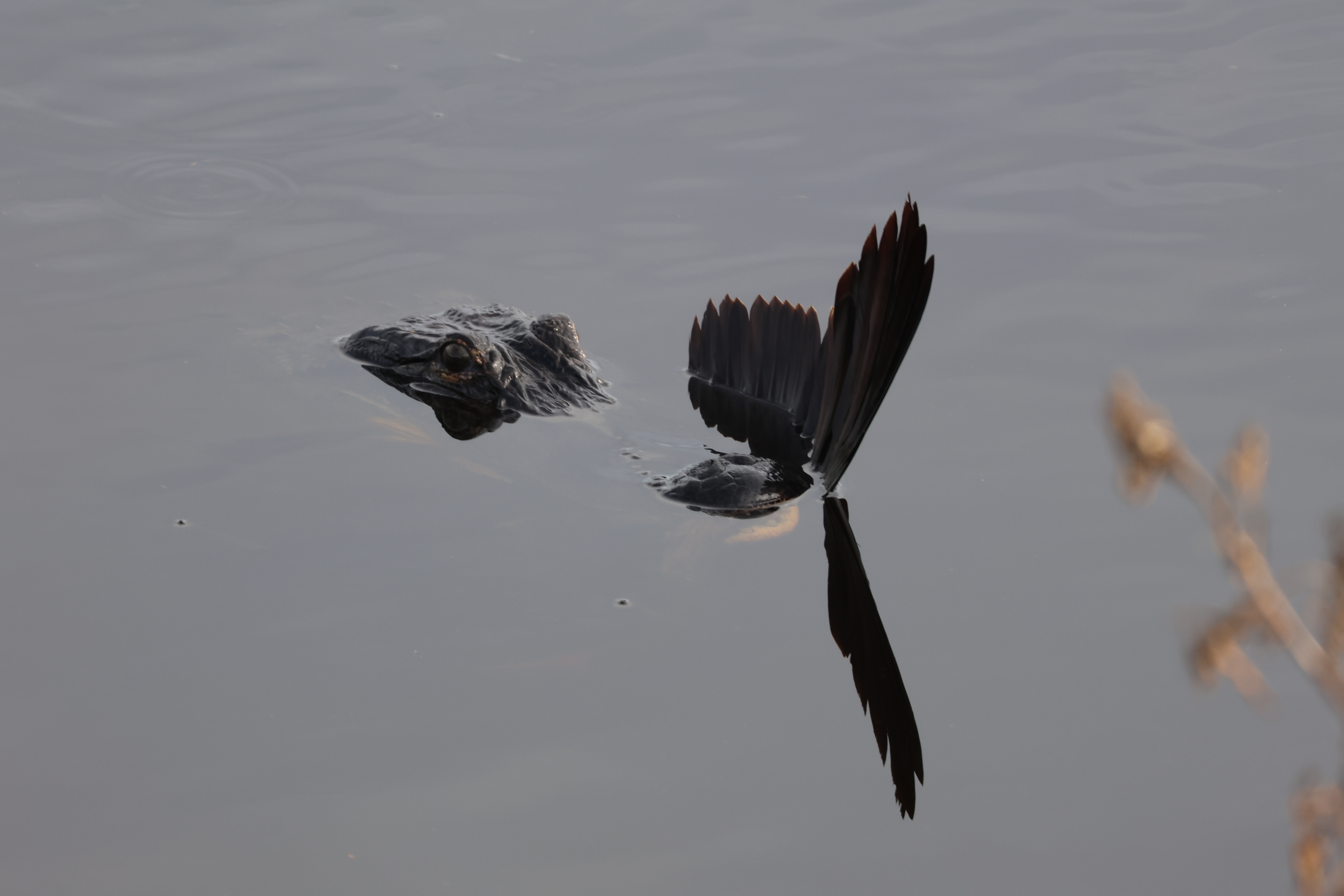 Natural history notes: Twice I have seen alligators swimming with dead birds in their jaws. In both cases, I have been unable to identify the species of bird. In one case the dark black feathers make me think it is possibly an Anhinga. In the other case, the yellow webbed-feet indicate some kind of water bird. I frequently see alligators and birds (particularly herons) in very close proximity. For example, alligators often bask at the water’s edge and various species of heron hunt small fish in the shallows only a few feet away. Yet, I have not seen an alligator make a lunge toward a heron. Perhaps, alligators know that these birds are very vigilant and attempting to capture them would have such low probability of success that it is not worth the energy of making an attempt.