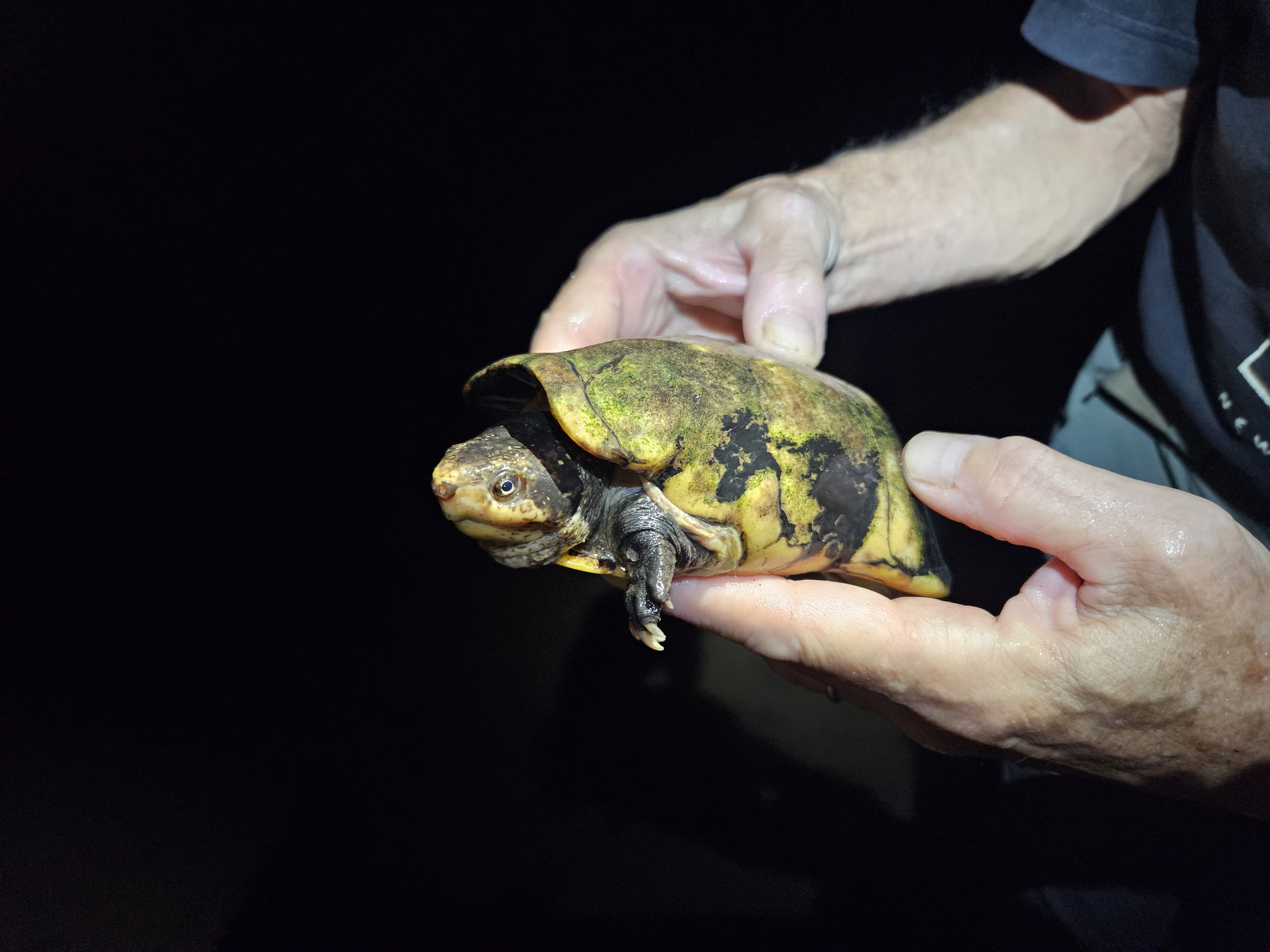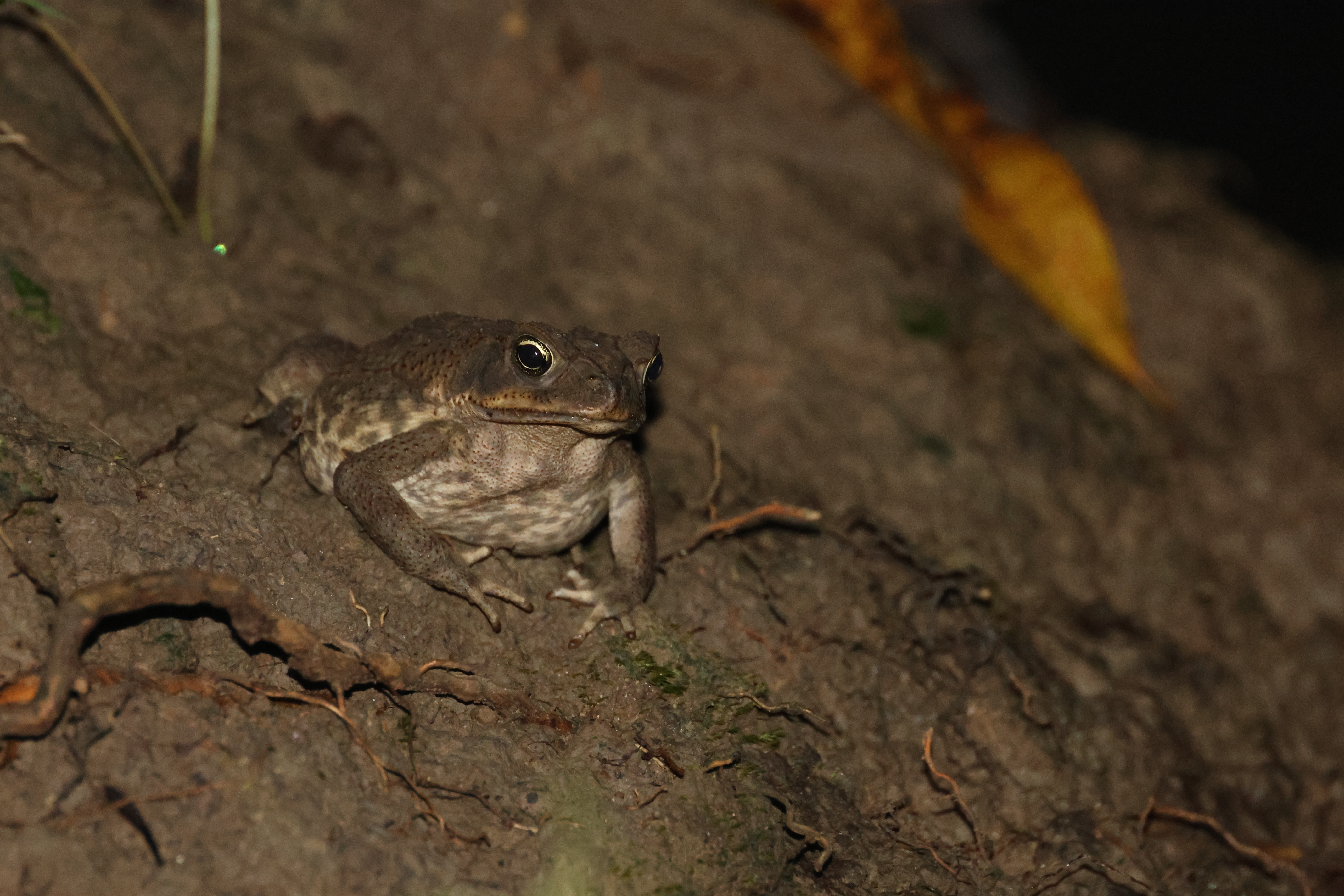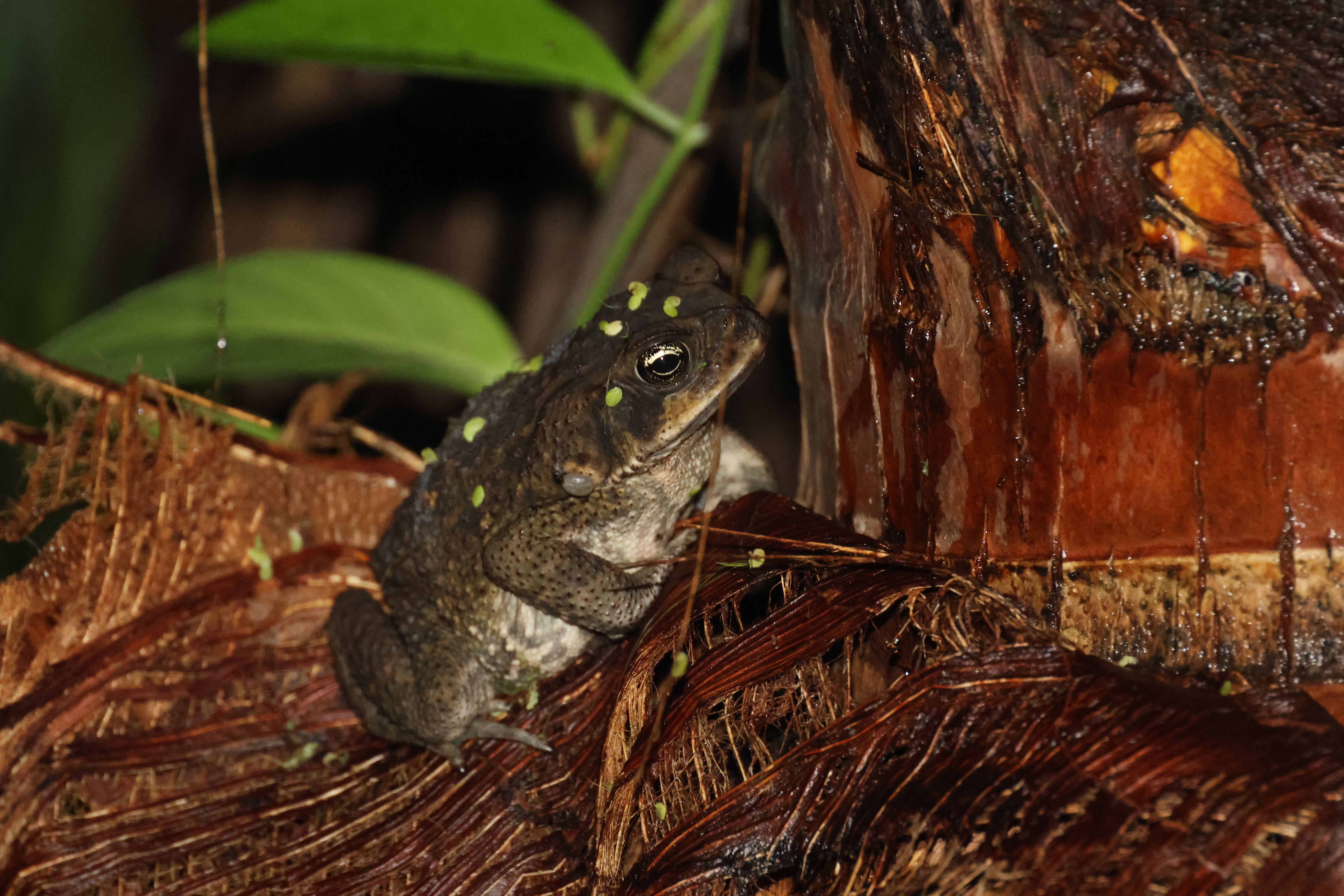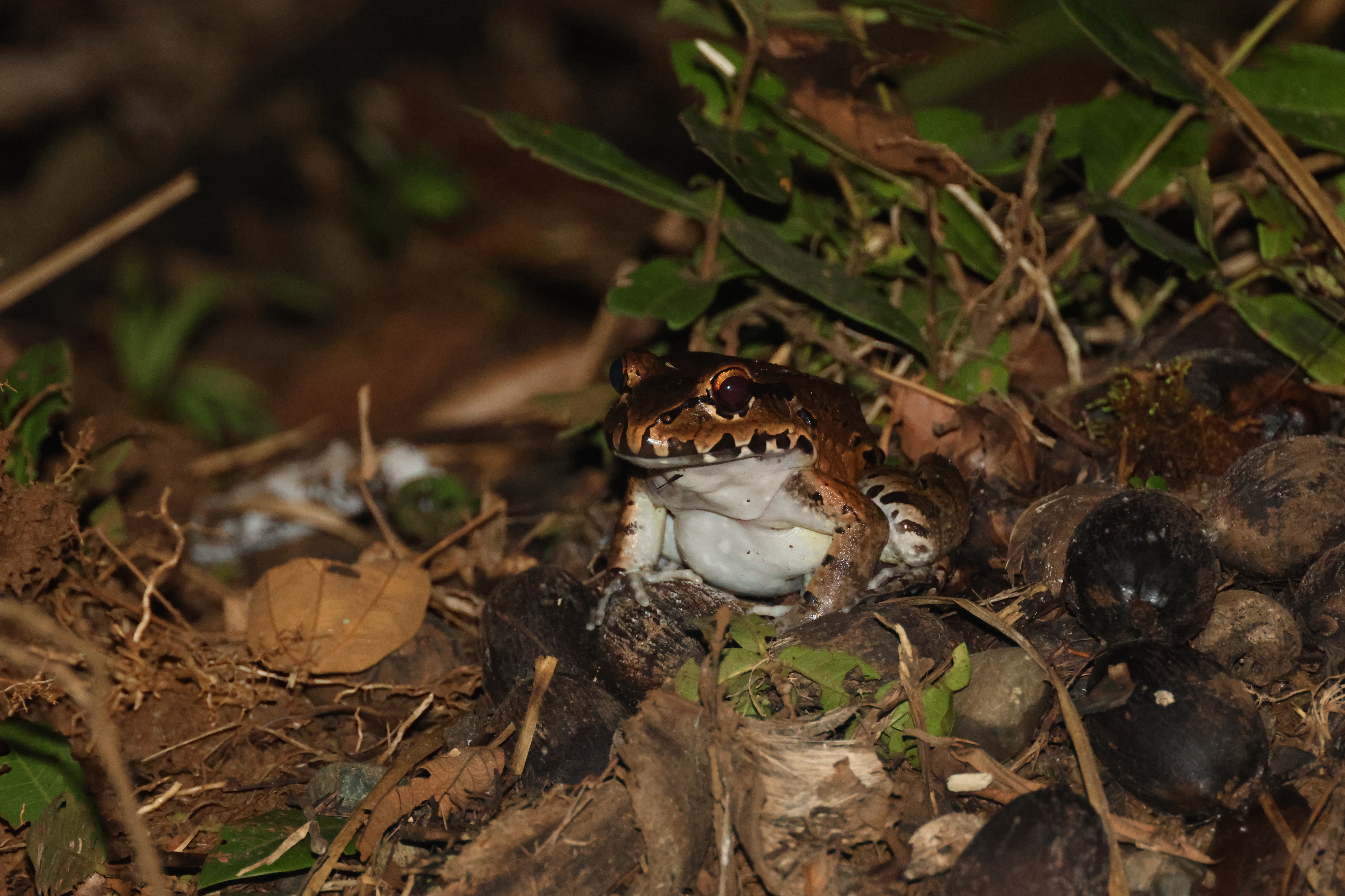 This large (up to 6 inches in length) terrestrial and noctural frog was readily spotted via headlamp due to its glowing red eyes (this is due to a reflective layer behind the retina called the tapetum lucidum). This species also goes by the common name: giant bullfrog. A closely related species (Leptodactylus fallax) found on the Caribbean islands of Dominica and Montserrat is a local delicacy known as the ‘mountain chicken’ and has been hunted to near extinction. Male L. savagei have robust forearms (evident in the last two photos) which are apparently used in territorial clashes with other males and to grasp females during mating. Like all Leptodactylus species, L. savagei is a foam nester. During mating bouts a foam nest is constructed by churning air, water, and secretions into a froth. Fertilized eggs are deposited into the foam, which forms a hardened outer layer while retaining a moist interior. The eggs hatch and the tadpoles complete metamorphosis within this nest over the course of a month.