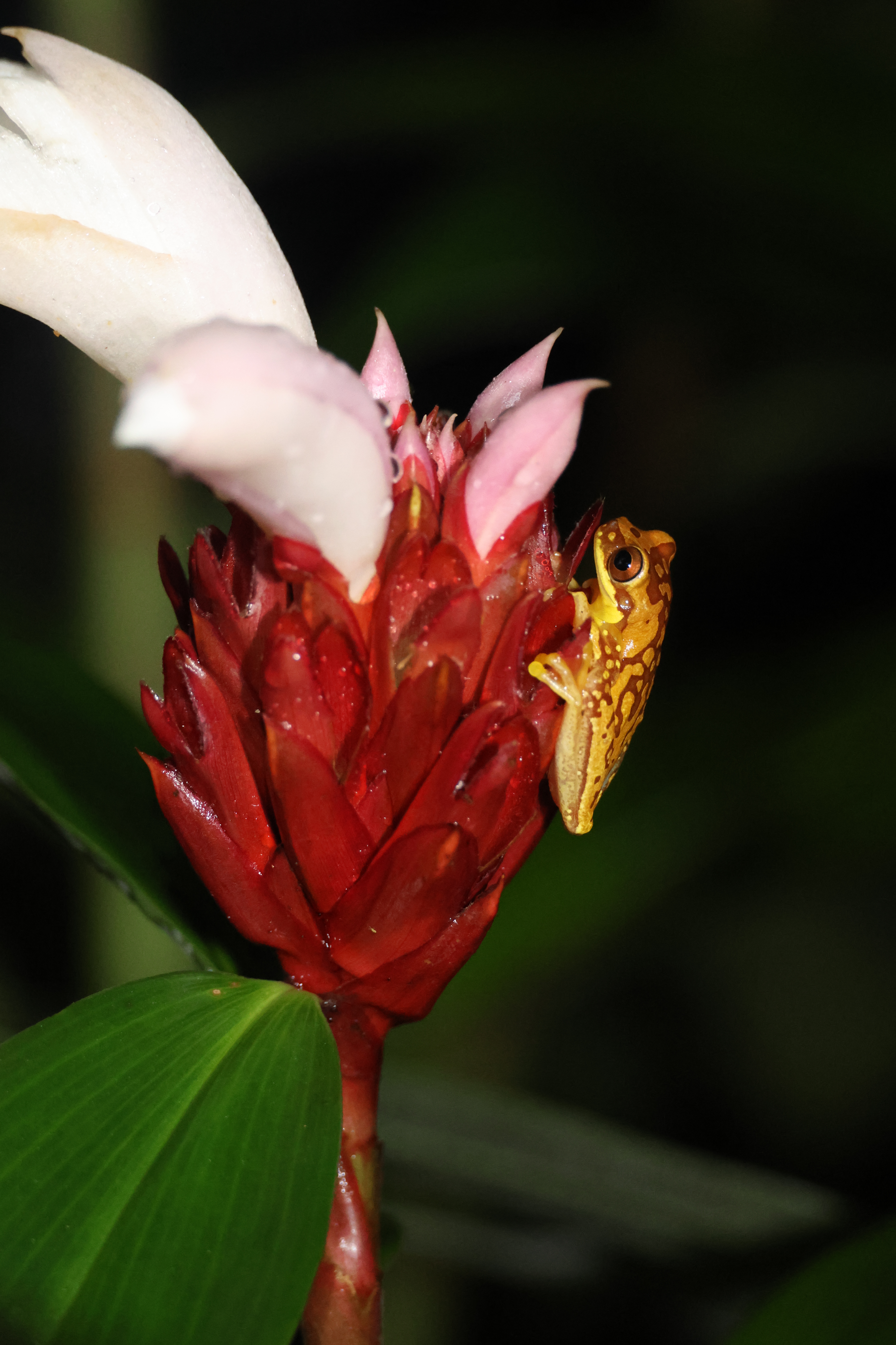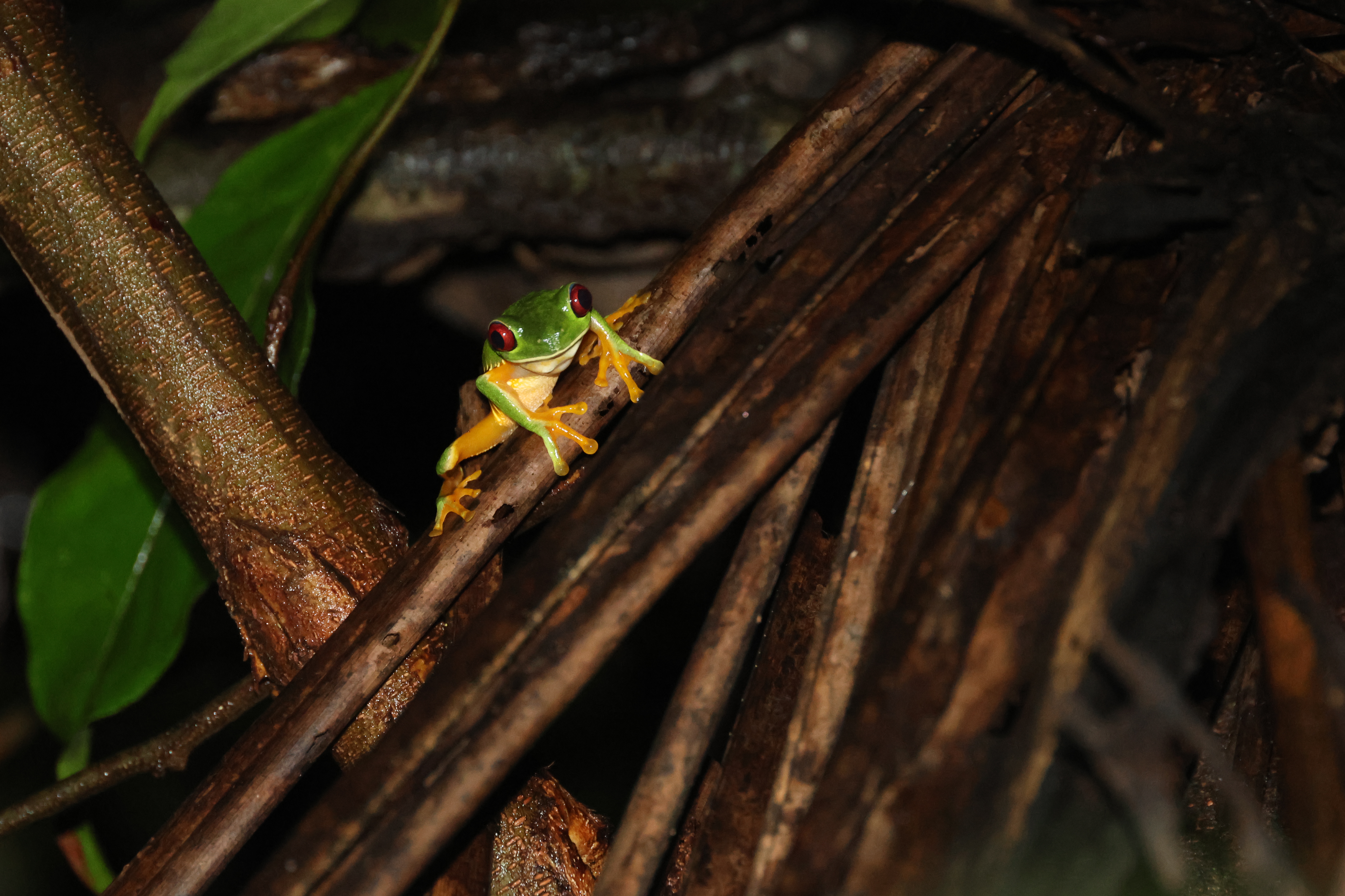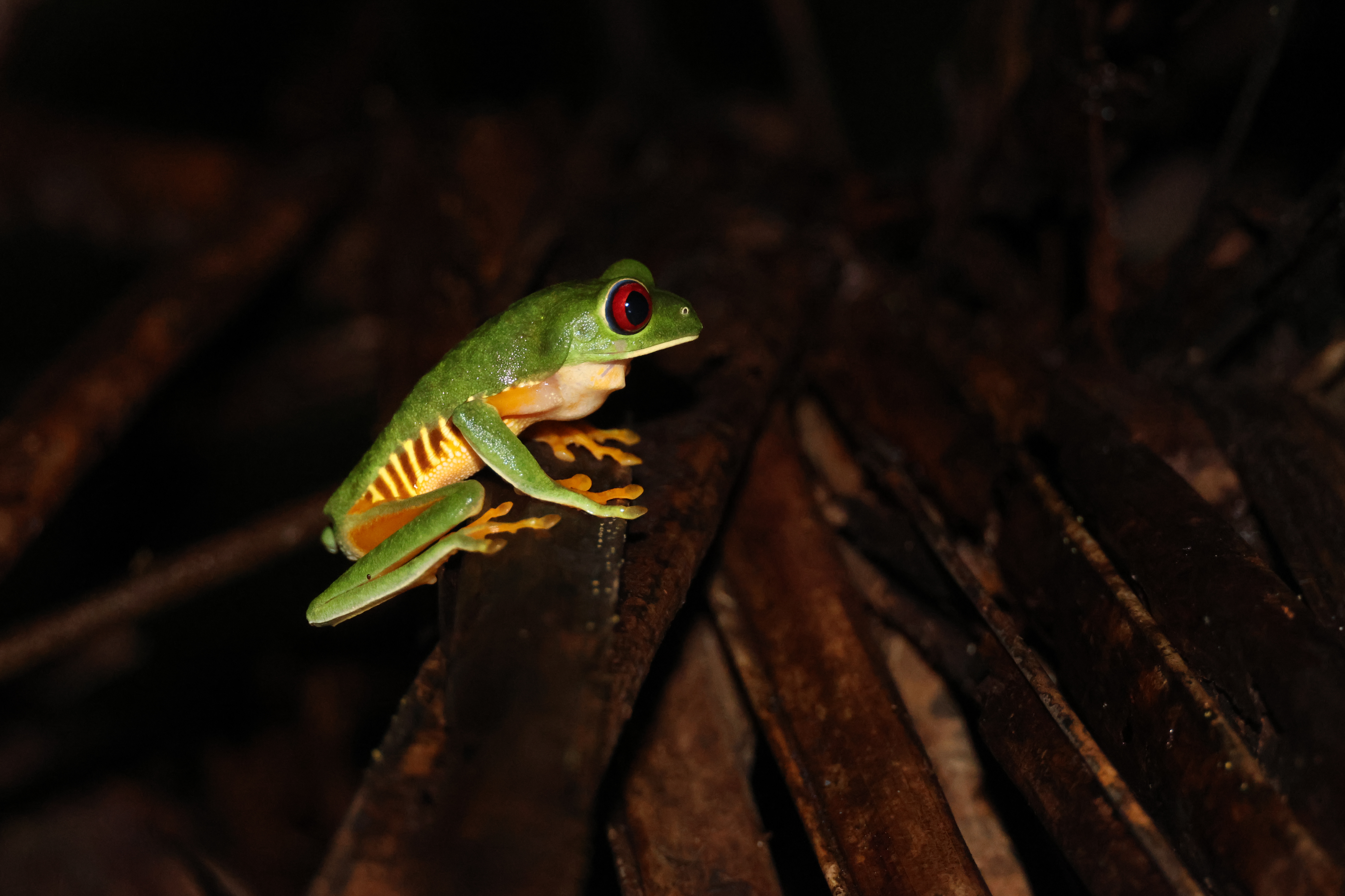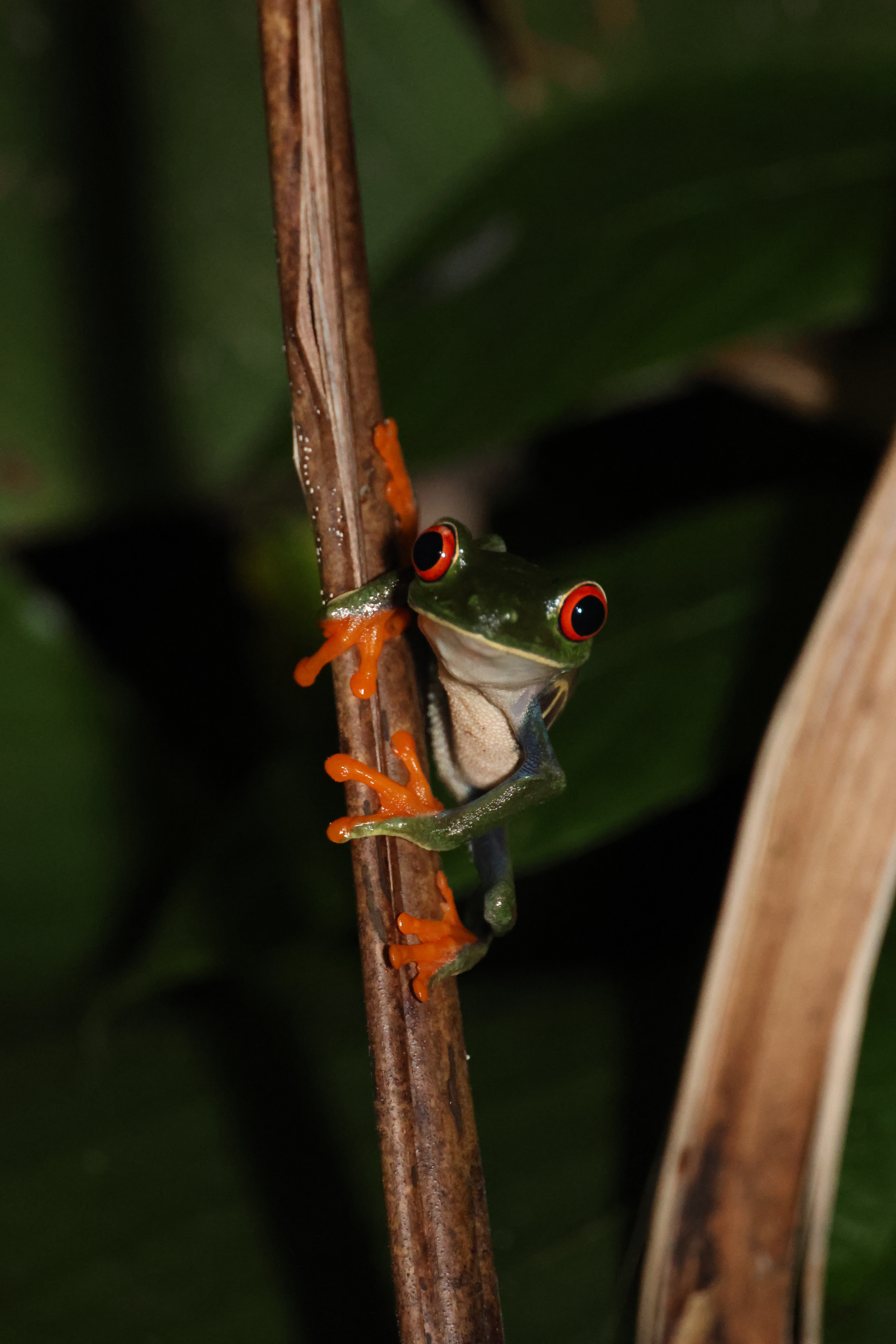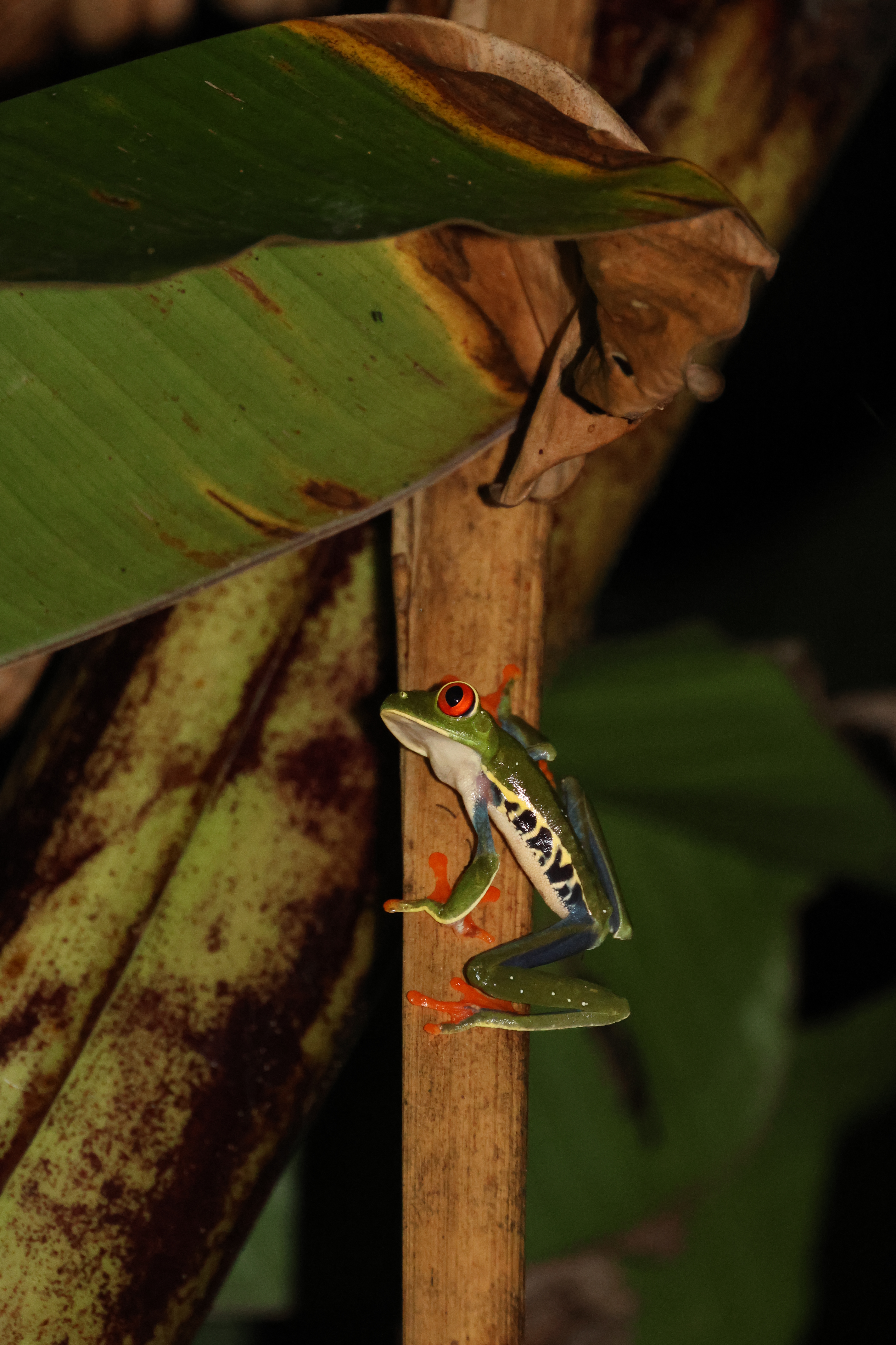 All the frog photos shown above were taken at night, save those of the Strawberry poison frog, and about half of the reptile photos were as well. If you want to see frogs (particularly in the tropics) your best bet is to explore at night, as most species are nocturnal. A good headlamp is important, and one can maximize ones chances by searching around waterbodies, particularly after it has rained.