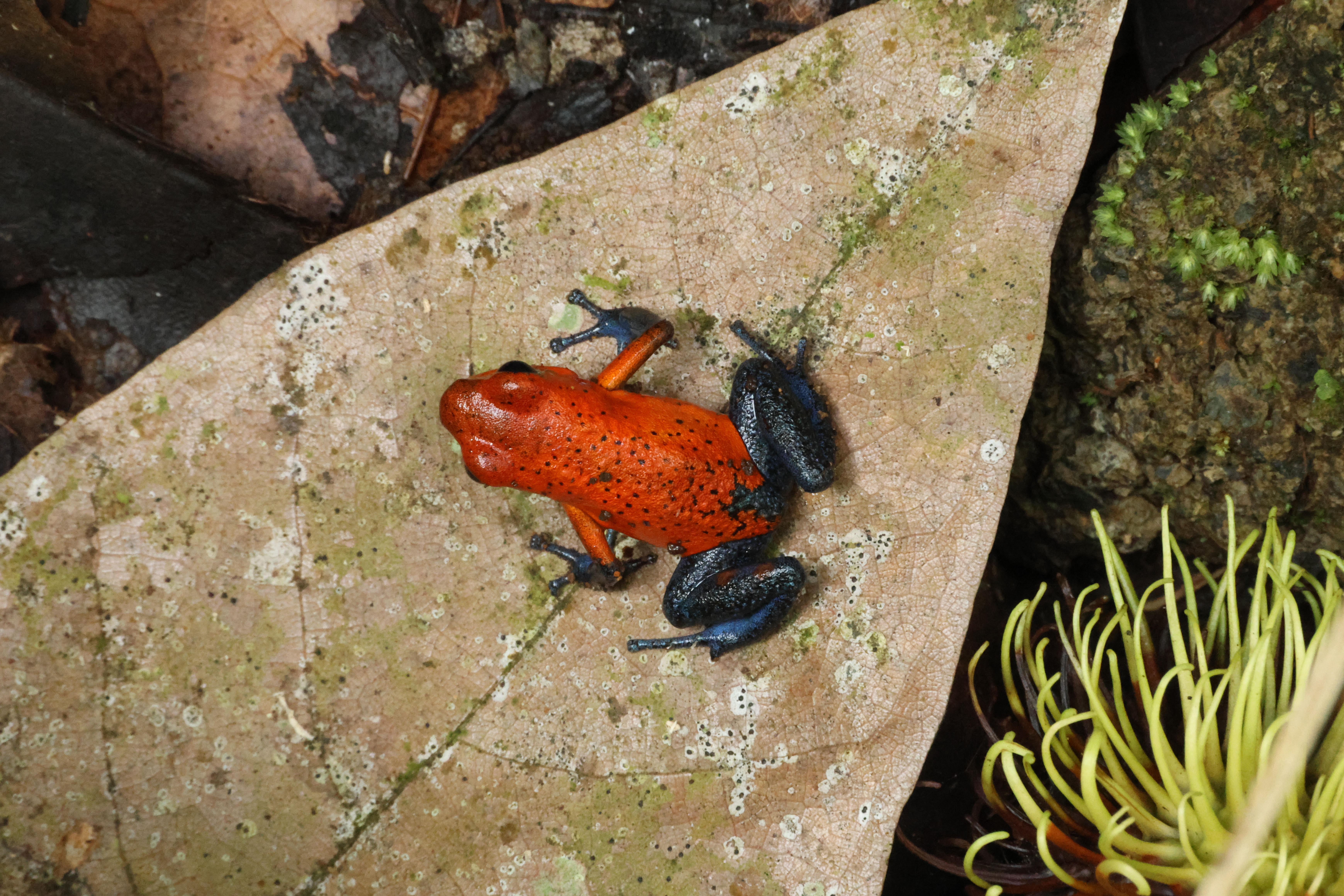 This species, also known as the blue jeans poison frog, exhibits a wide variety of different color morphs. Active during the daytime, these frogs are toxic and their bright coloration serves as a warning to would-be predators. This species exhibits a rather remarkable form of biparental care. Males attend to small clutches of terrestrially deposited eggs, including keeping them hydrated by emptying their bladder upon them. When the eggs hatch as tadpoles, the female carries them individually or in small groups (upon her back) to small water-filled tree holes or bromeliad axils, where they are individually deposited. The female then returns every few days and deposits unfertilized eggs into the water; these eggs serve as food for her developing tadpoles. Metamorphosis into small froglets occurs in one to two months.