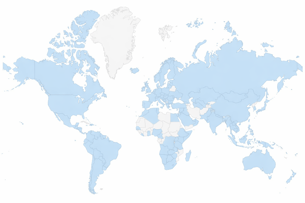 Locations of viewers depicted on a world map. The site has had at least one viewer from 152 different countries (depicted in blue). There are about 20 countries in Africa from which I haven’t had any views (depicted in light gray). Outside Africa, countries that lack any viewers include Afghanistan, Armenia, Azerbaijan, Belarus, Cuba, French Guiana, Greenland, Iran, Kyrgystan, North Korea, Tajikistan, and Yemen. It may be difficult to get viewers from some of the above-mentioned countries as the internet, and even access to the site, may be restricted.