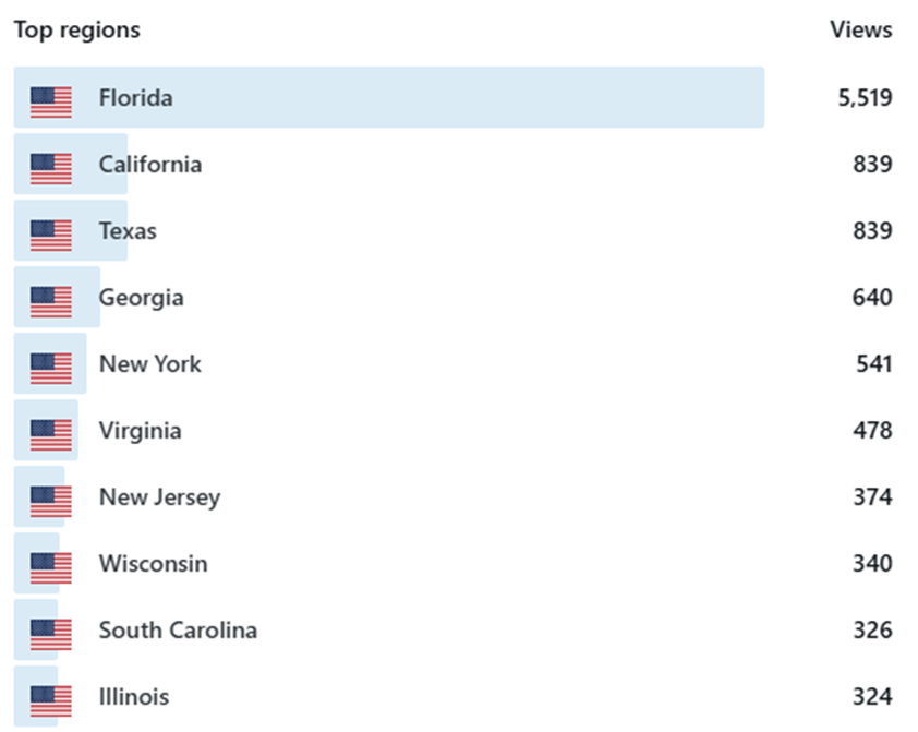 Top ten U.S. states in terms of views. There have been viewers from all 50 states. Unsurprisingly, given that Florida wildlife is a prominent topic in many posts, Florida has had the most viewers.