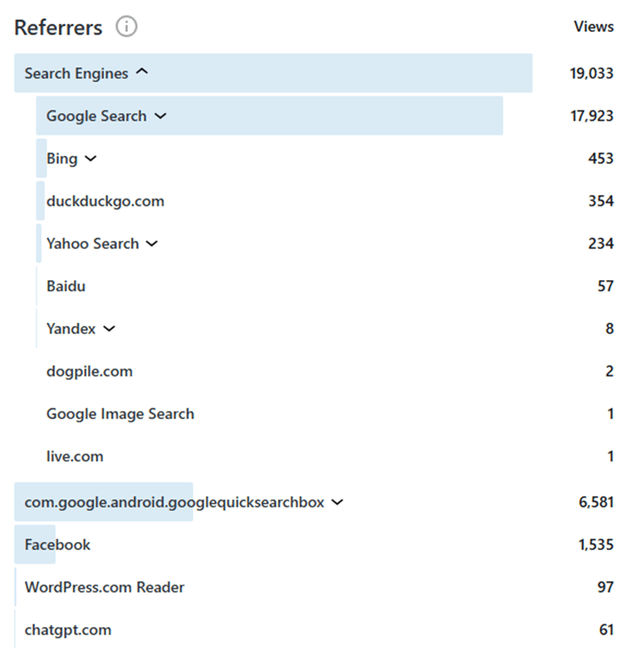 The vast majority of traffic comes via Google Search. This is followed by Facebook. Interestingly, some traffic has come from ChatGPT. This indicates that this site is being used as a source by AI. It will be interesting to see if this proportion grows in the future as AI comes to play a bigger role both in terms of internet search and information synthesis.