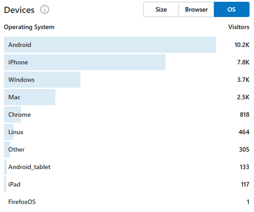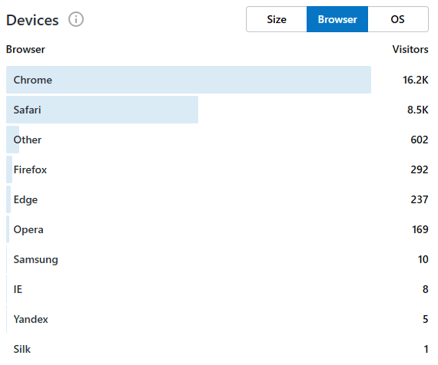 Finally, Google Chrome and Safari dominate in terms of internet browsers used by site visitors and visitors use a variety of operating systems.