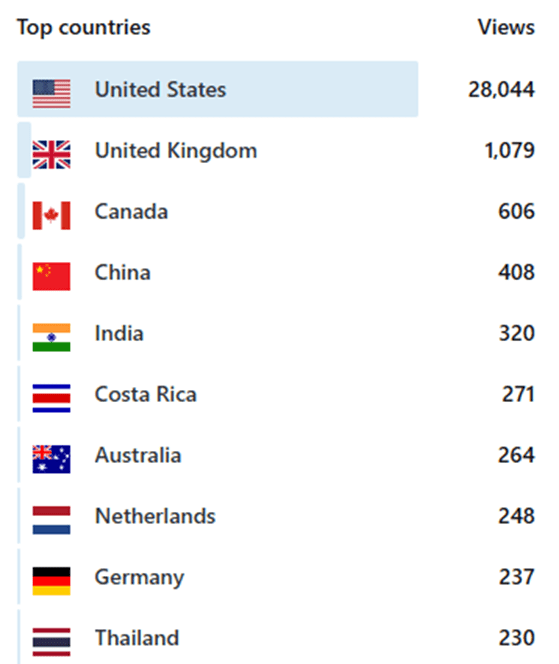 Top ten countries in terms of views. Unsurprisingly, the top 3 are English-speaking.